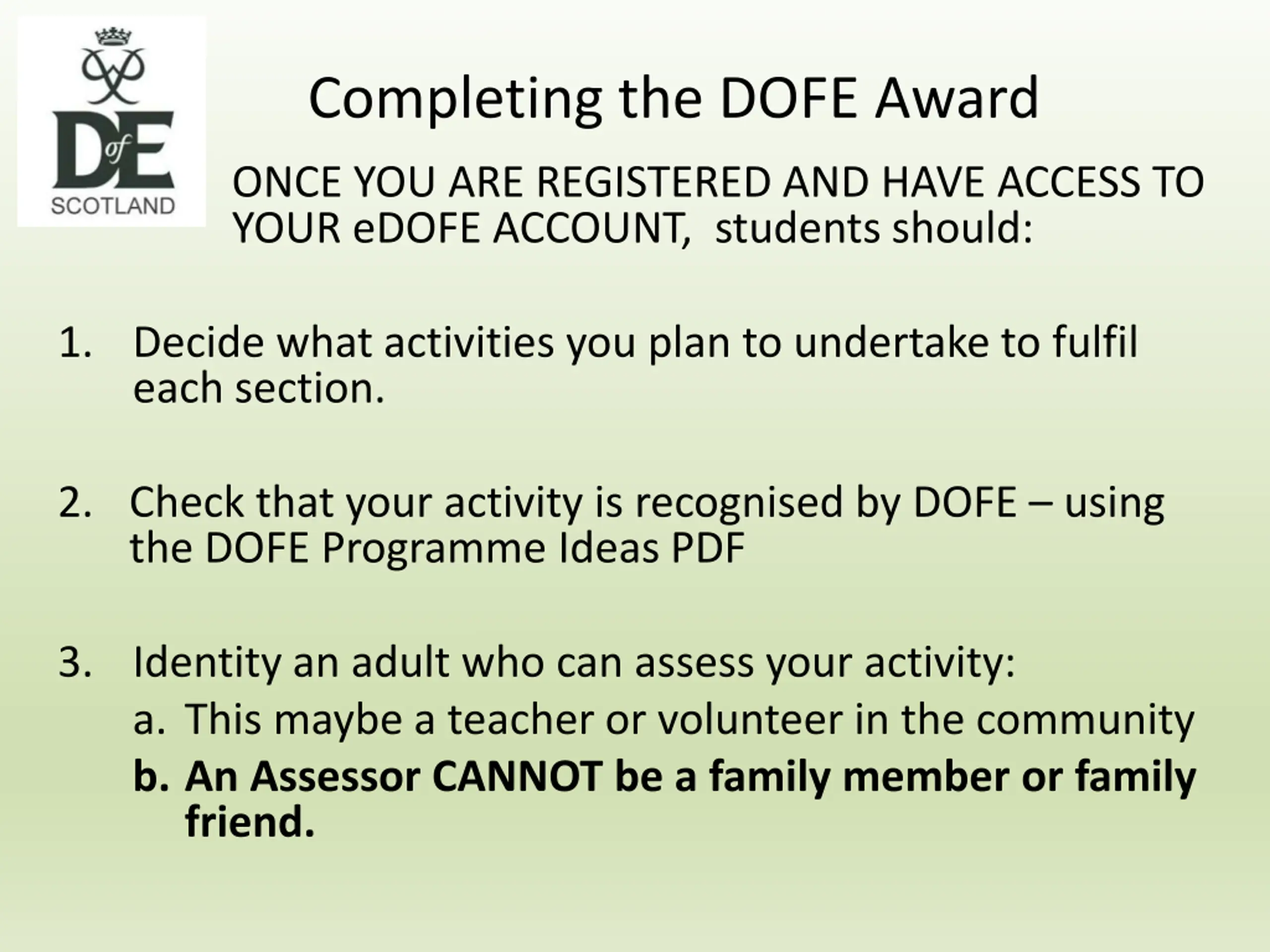 Completing the DOFE Award ONCE YOU ARE REGISTERED AND HAVE ACCESS TO YOUR eDOFE ACCOUNT, students should: 1. Decide what activities you plan to undertake to fulfil each section. 2. Check that your activity is recognised by DOFE using the DOFE Programme Ideas PDF 3. Identity an adult who can assess your activity: a. This maybe a teacher or volunteer in the community b. An Assessor CANNOT be a family member or family friend.