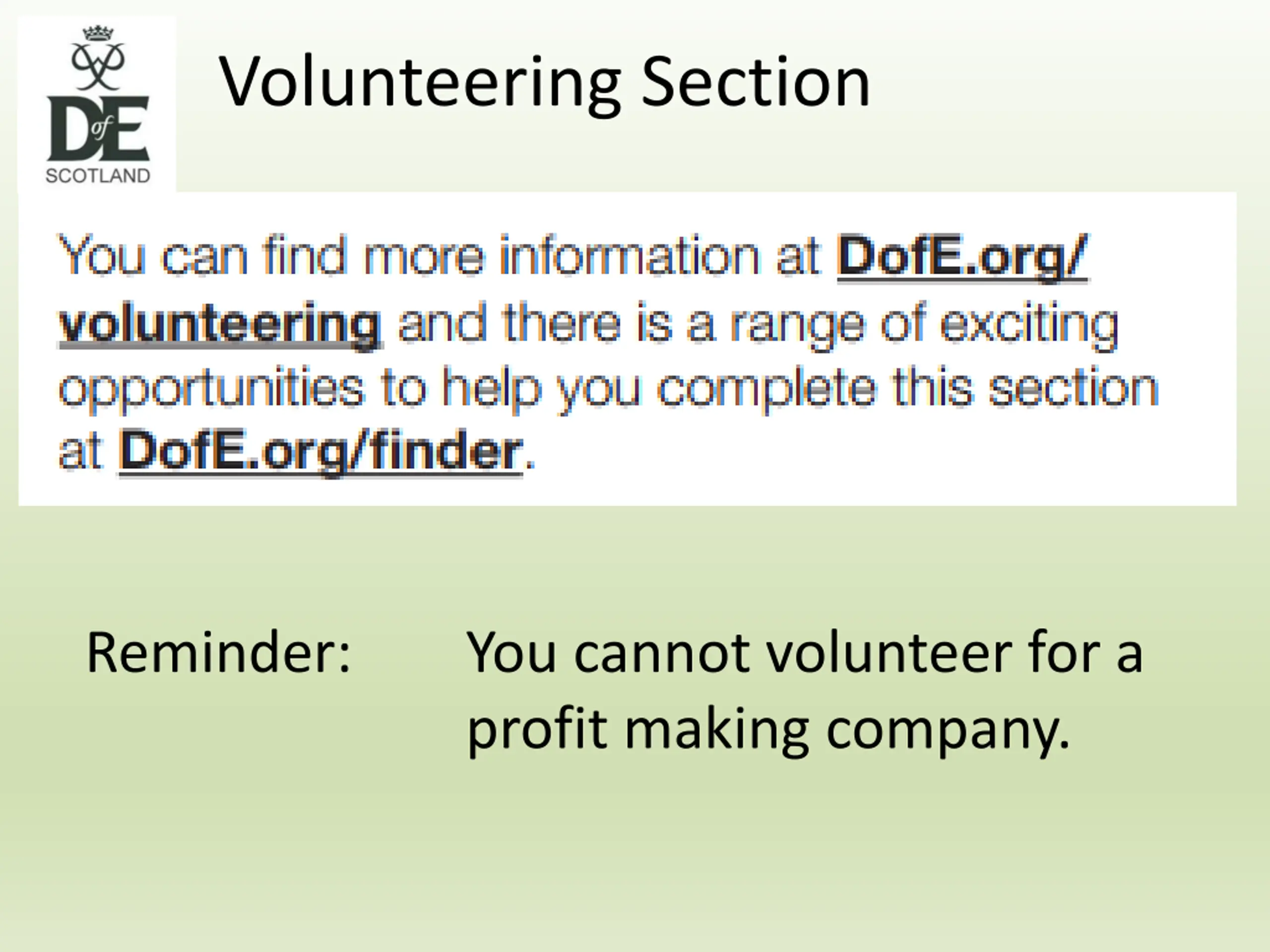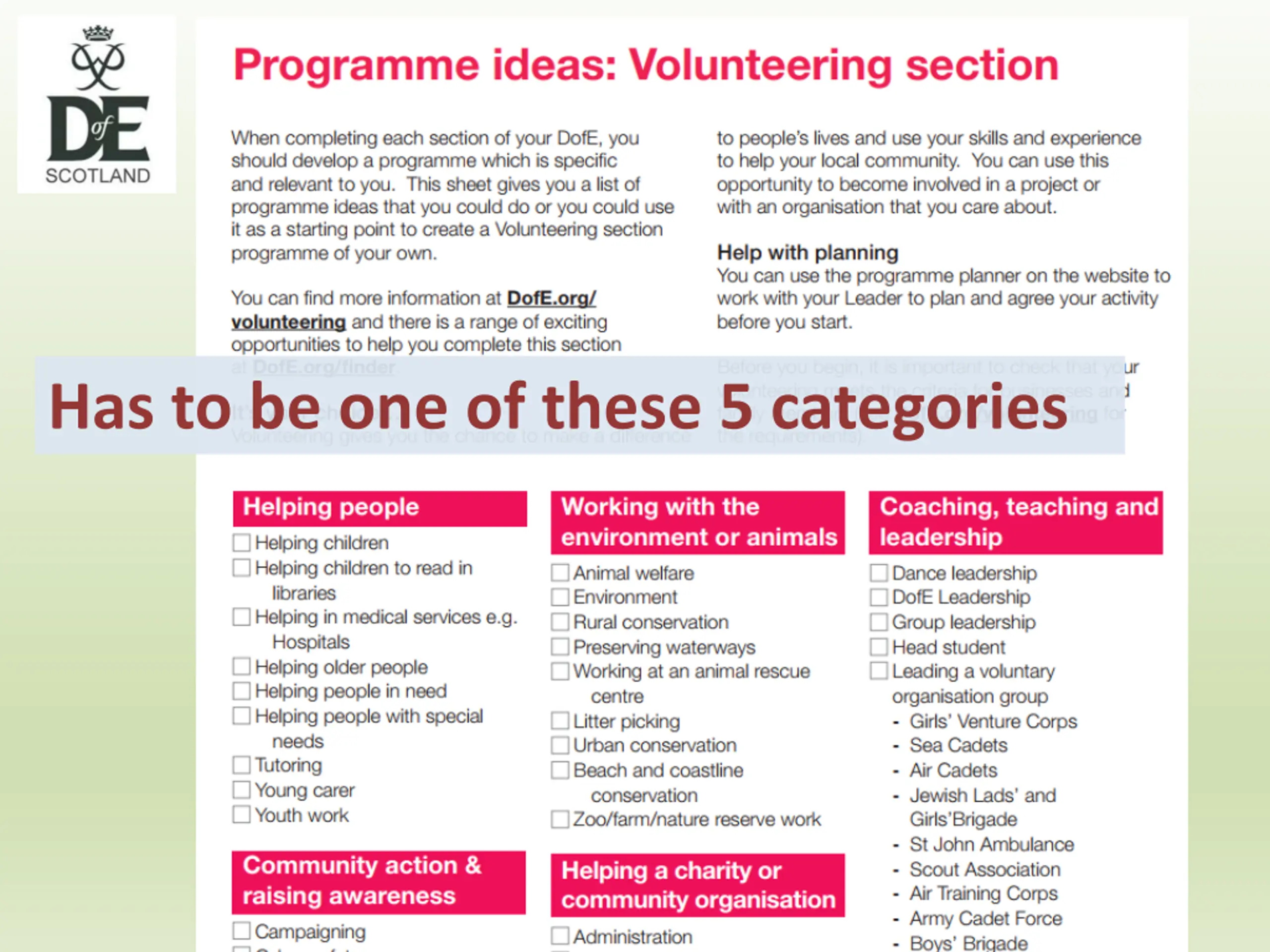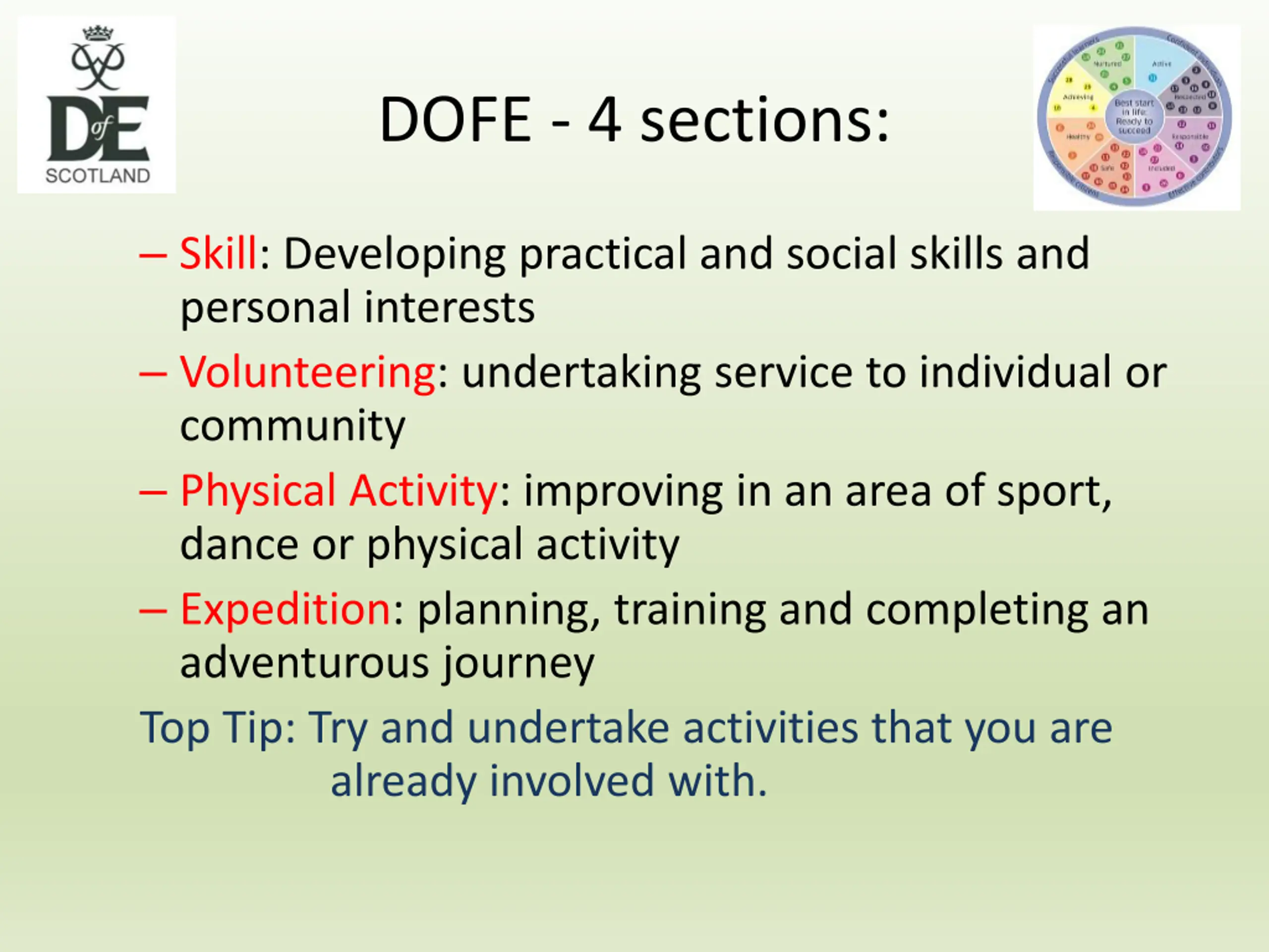 DOFE - 4 sections: Skill: Developing practical and social skills and personal interests Volunteering: undertaking service to individual or community Physical Activity: improving in an area of sport, dance or physical activity Expedition: planning, training and completing an adventurous journey Top Tip: Try and undertake activities that you are already involved with.
