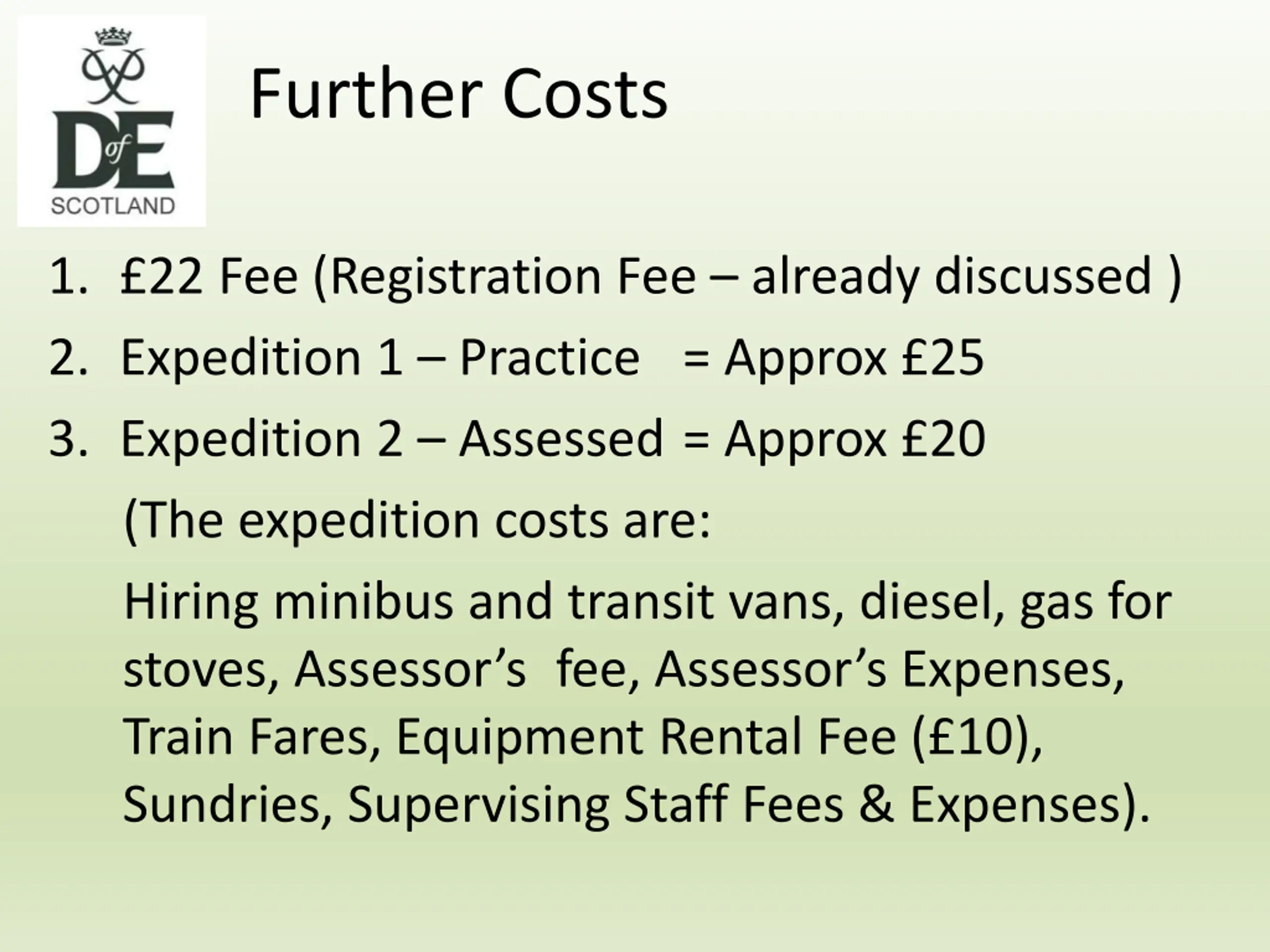 Further Costs 1. 22 Fee (Registration Fee already discussed ) 2. Expedition 1 Practice = Approx 25 3. Expedition 2 Assessed = Approx 20 (The expedition costs are: Hiring minibus and transit vans, diesel, gas for stoves, Assessor s fee, Assessor s Expenses, Train Fares, Equipment Rental Fee ( 10), Sundries, Supervising Staff Fees & Expenses).