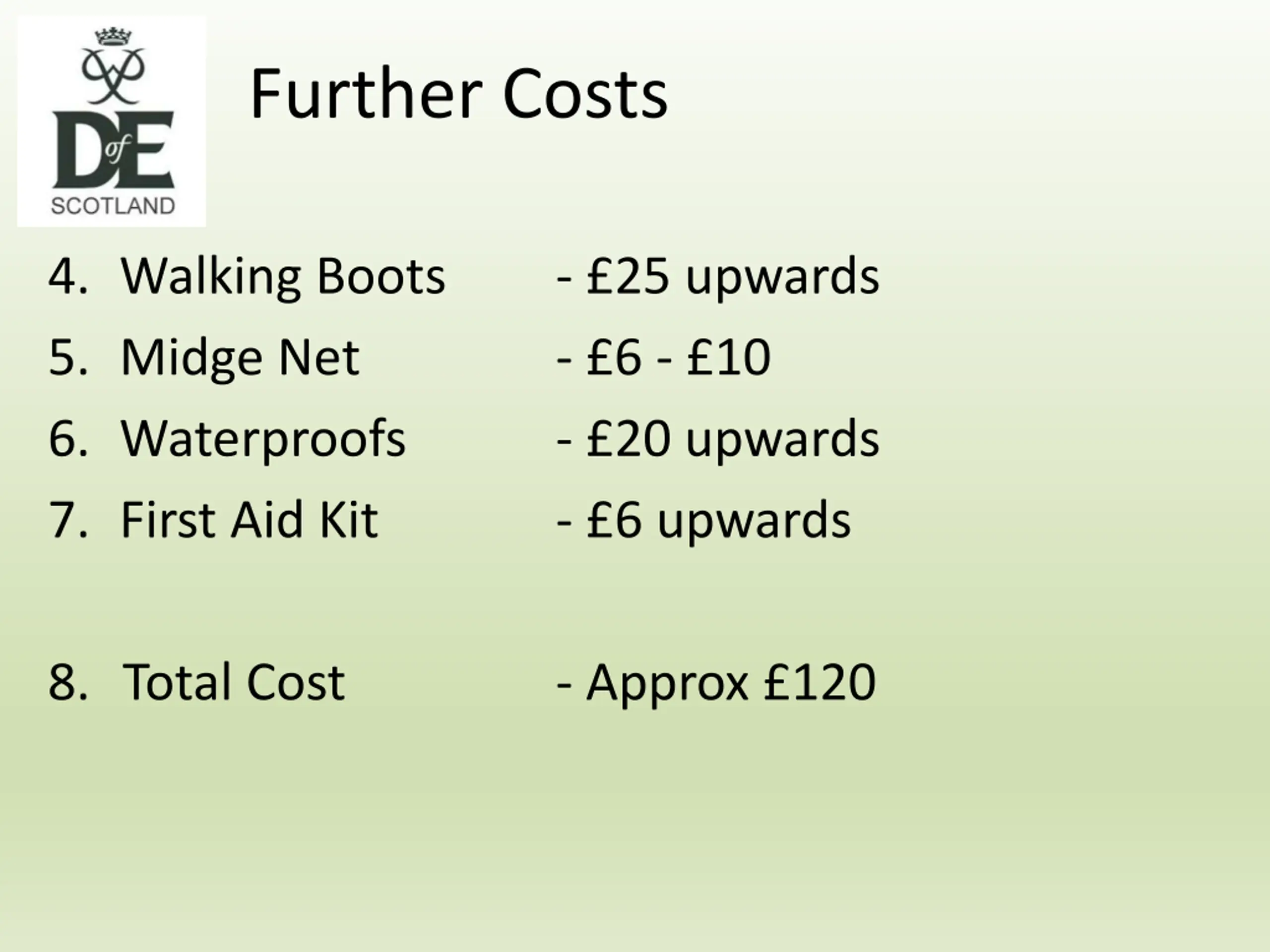 Further Costs 4. Walking Boots 5. Midge Net 6. Waterproofs 7. First Aid Kit - 25 upwards - 6 - 10 - 20 upwards - 6 upwards 8. Total Cost - Approx 120