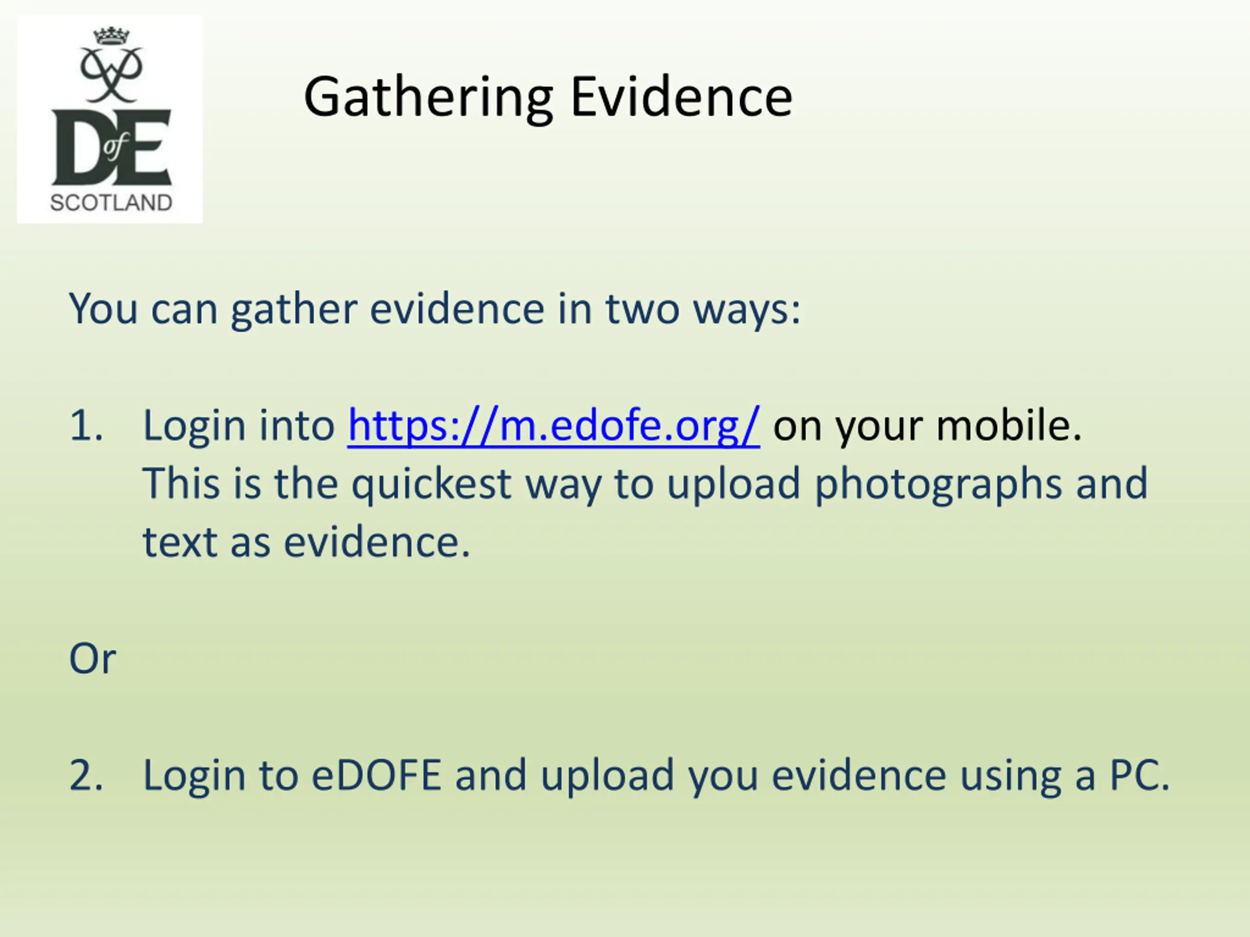 Gathering Evidence You can gather evidence in two ways: Login into https://m.edofe.org/ on your mobile. This is the quickest way to upload photographs and text as evidence. Or 2. Login to eDOFE and upload you evidence using a PC. You can gather evidence in two ways: 1. Login into https://m.edofe.org/ on your mobile. This is the quickest way to upload photographs and text as evidence. Or 2. Login to eDOFE and upload you evidence using a PC.