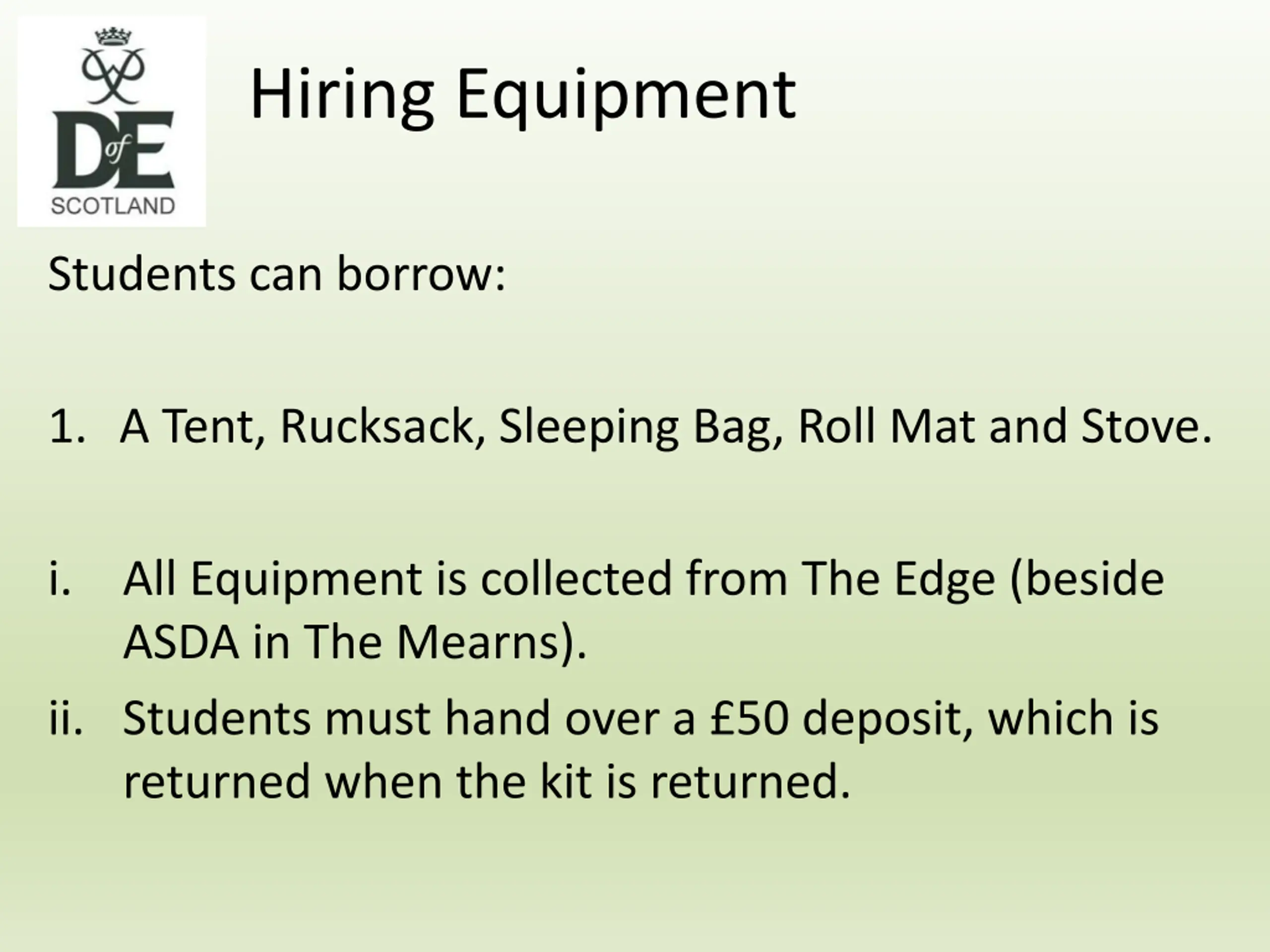 Hiring Equipment Students can borrow: 1. A Tent, Rucksack, Sleeping Bag, Roll Mat and Stove. i. All Equipment is collected from The Edge (beside ASDA in The Mearns). ii. Students must hand over a 50 deposit, which is returned when the kit is returned.