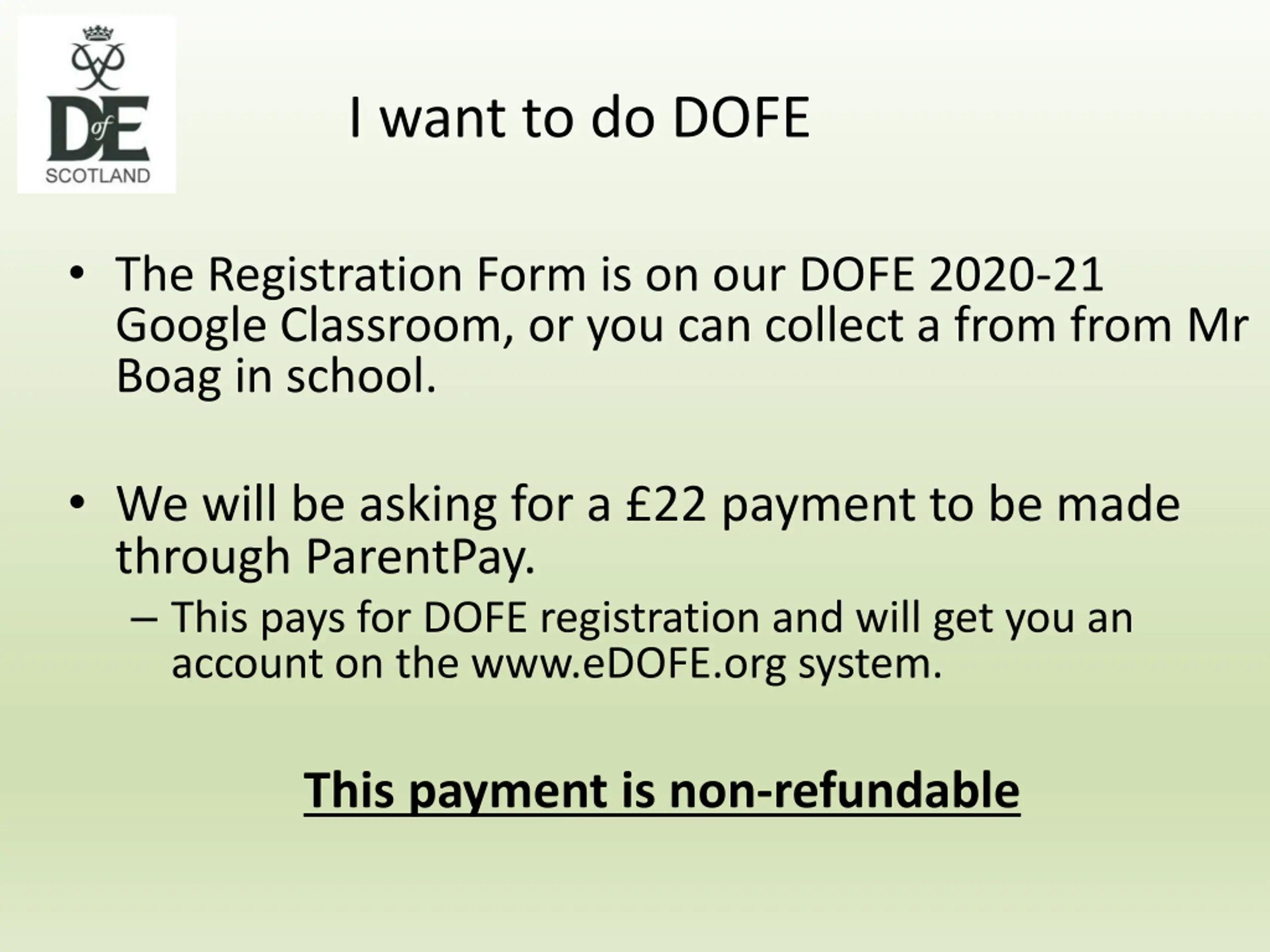 I want to do DOFE The Registration Form is on our DOFE 2020-21 Google Classroom, or you can collect a from from Mr Boag in school. We will be asking for a 22 payment to be made through ParentPay. This pays for DOFE registration and will get you an account on the www.eDOFE.org system. This payment is non-refundable