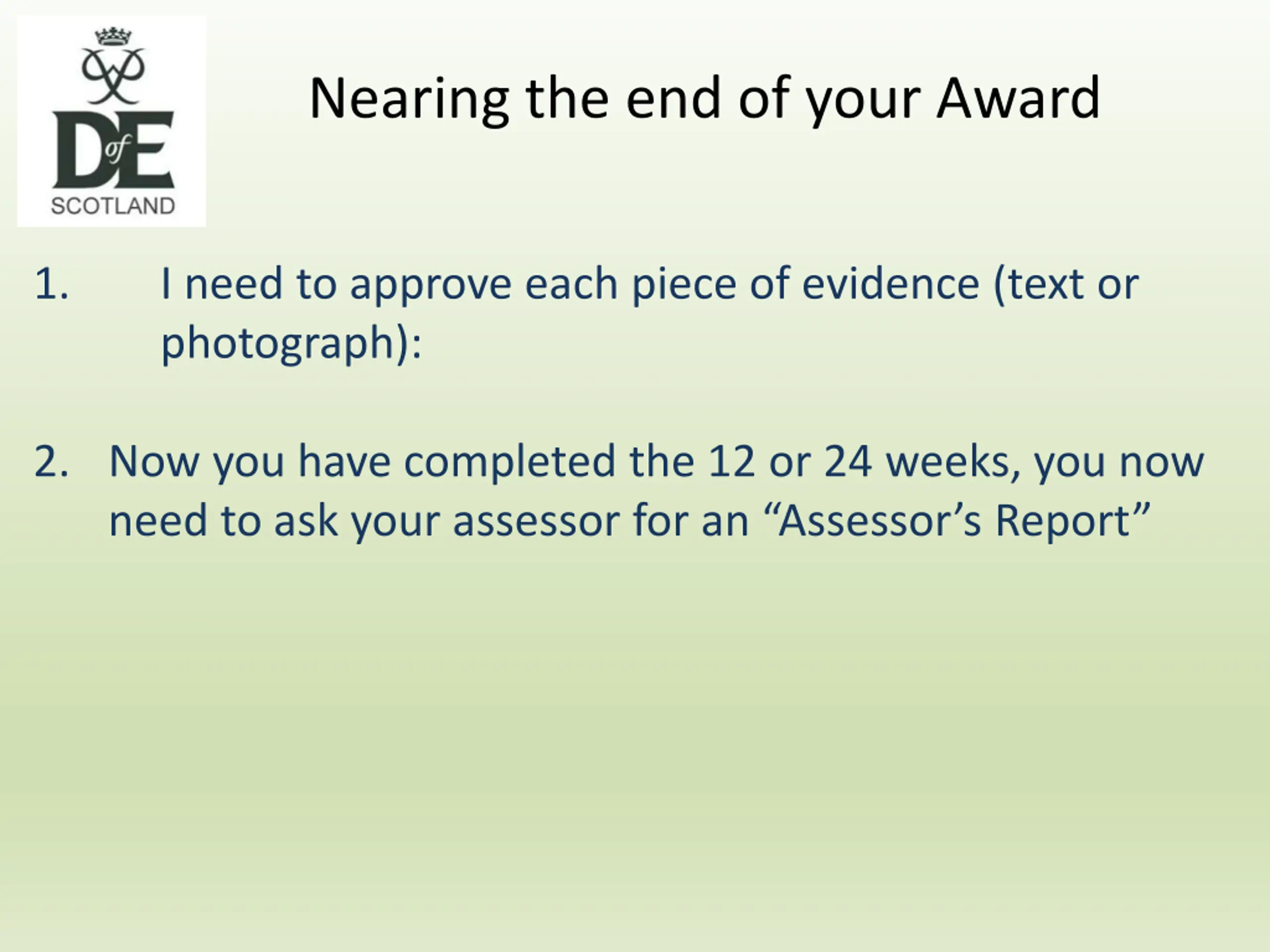 Nearing the end of your Award 1.I need to approve each piece of evidence (text or photograph): 2.Now you have completed the 12 or 24 weeks, you now need to ask your assessor for an Assessor s Report 1. I need to approve each piece of evidence (text or photograph): 2. Now you have completed the 12 or 24 weeks, you now need to ask your assessor for an Assessor s Report
