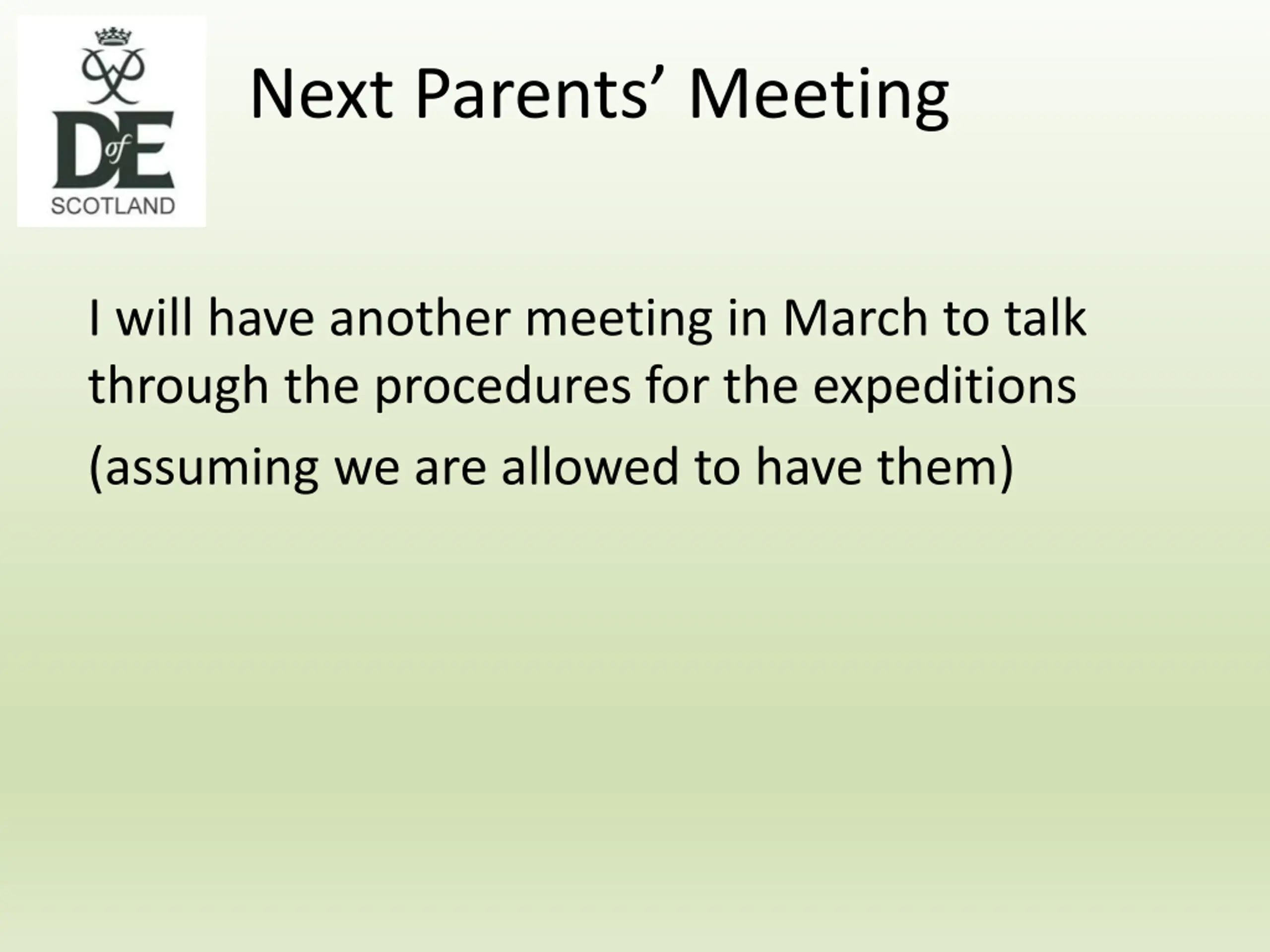 Next Parents Meeting I will have another meeting in March to talk through the procedures for the expeditions (assuming we are allowed to have them)
