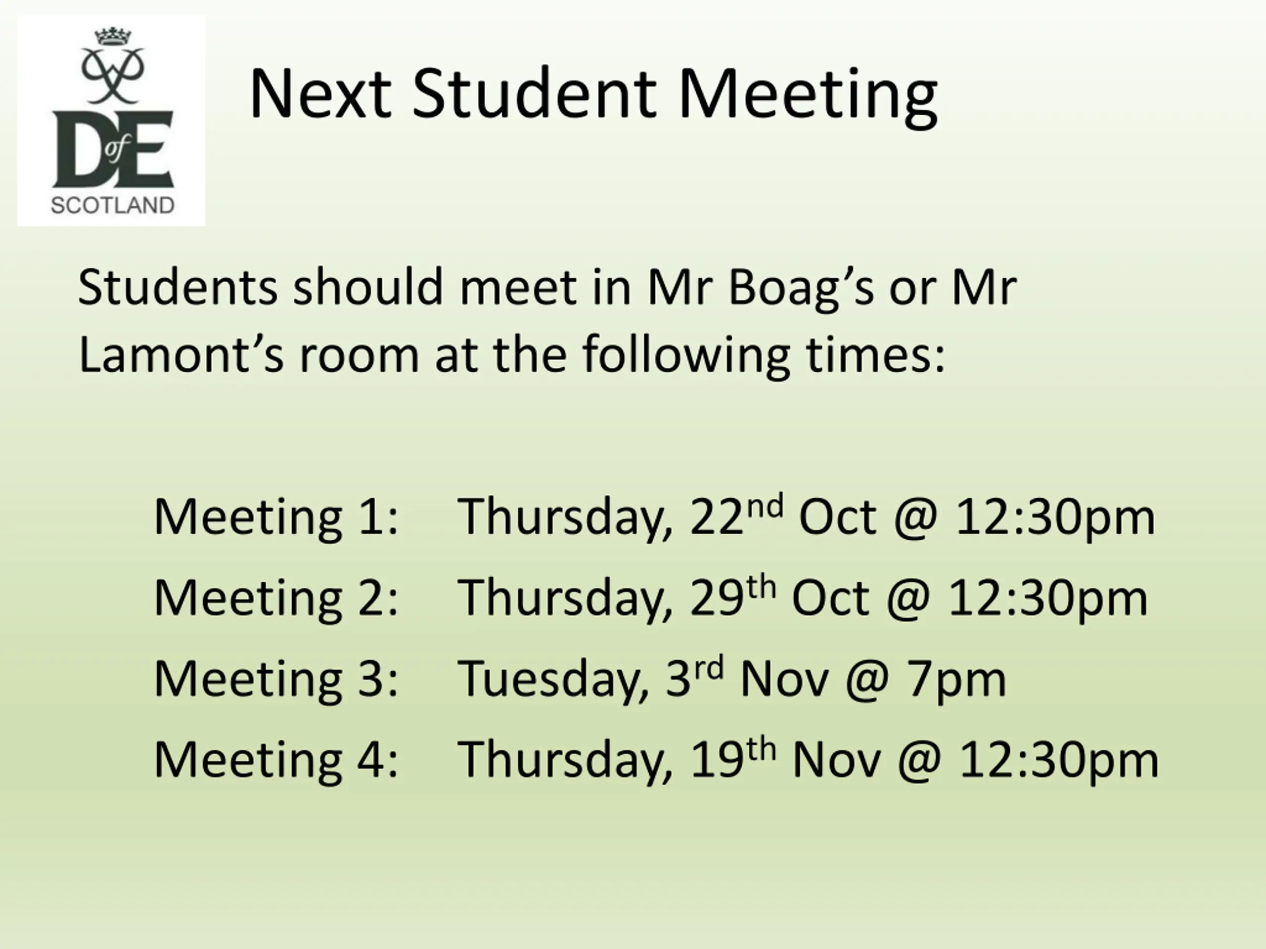Next Student Meeting Students should meet in Mr Boag s or Mr Lamont s room at the following times: Meeting 1: Thursday, 22nd Oct @ 12:30pm Meeting 2: Thursday, 29th Oct @ 12:30pm Meeting 3: Tuesday, 3rd Nov @ 7pm Meeting 4: Thursday, 19th Nov @ 12:30pm