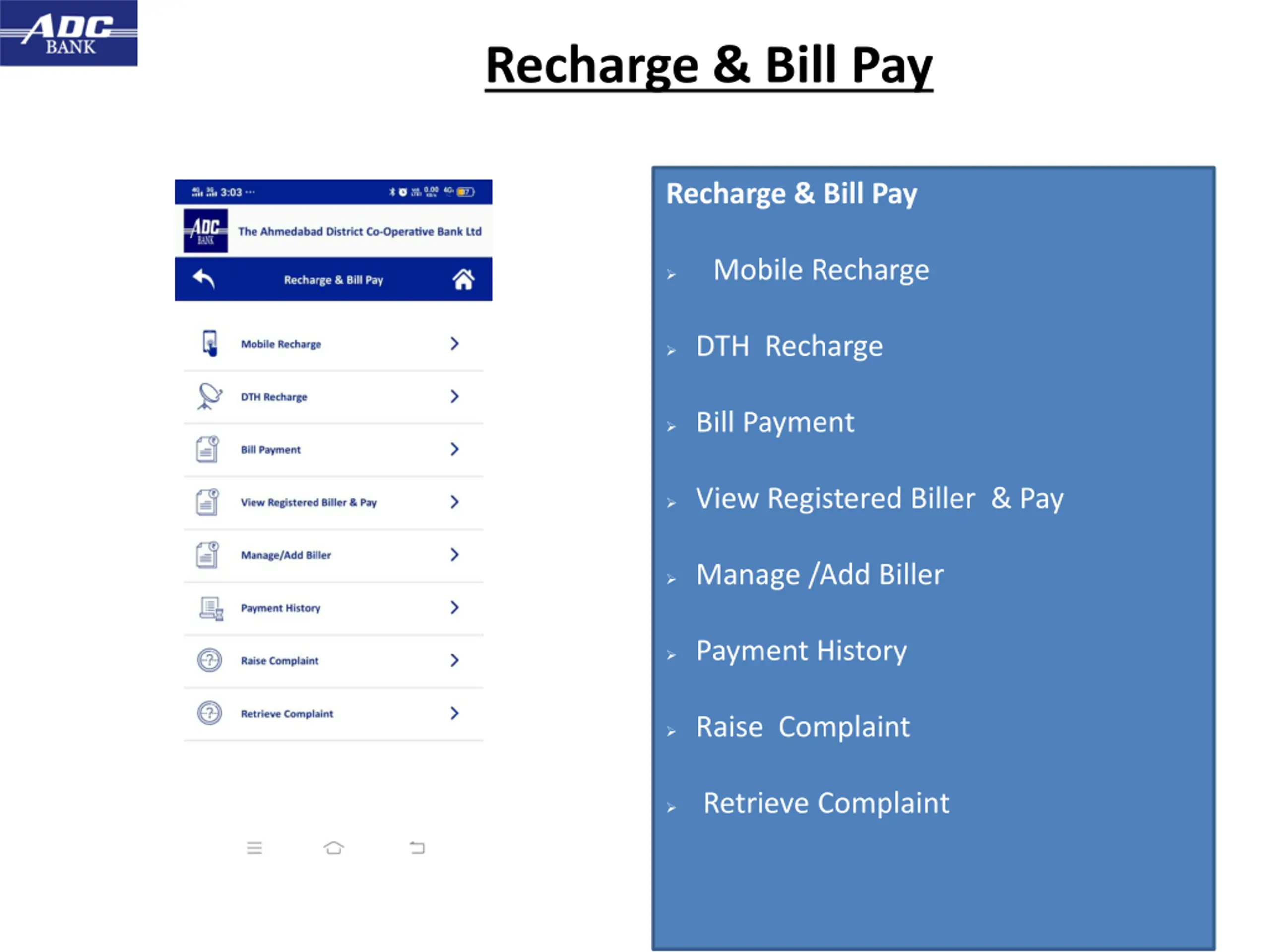 Recharge & Bill Pay Recharge & Bill Pay Mobile Recharge DTH Recharge Bill Payment View Registered Biller & Pay Manage /Add Biller Payment History Raise Complaint Retrieve Complaint