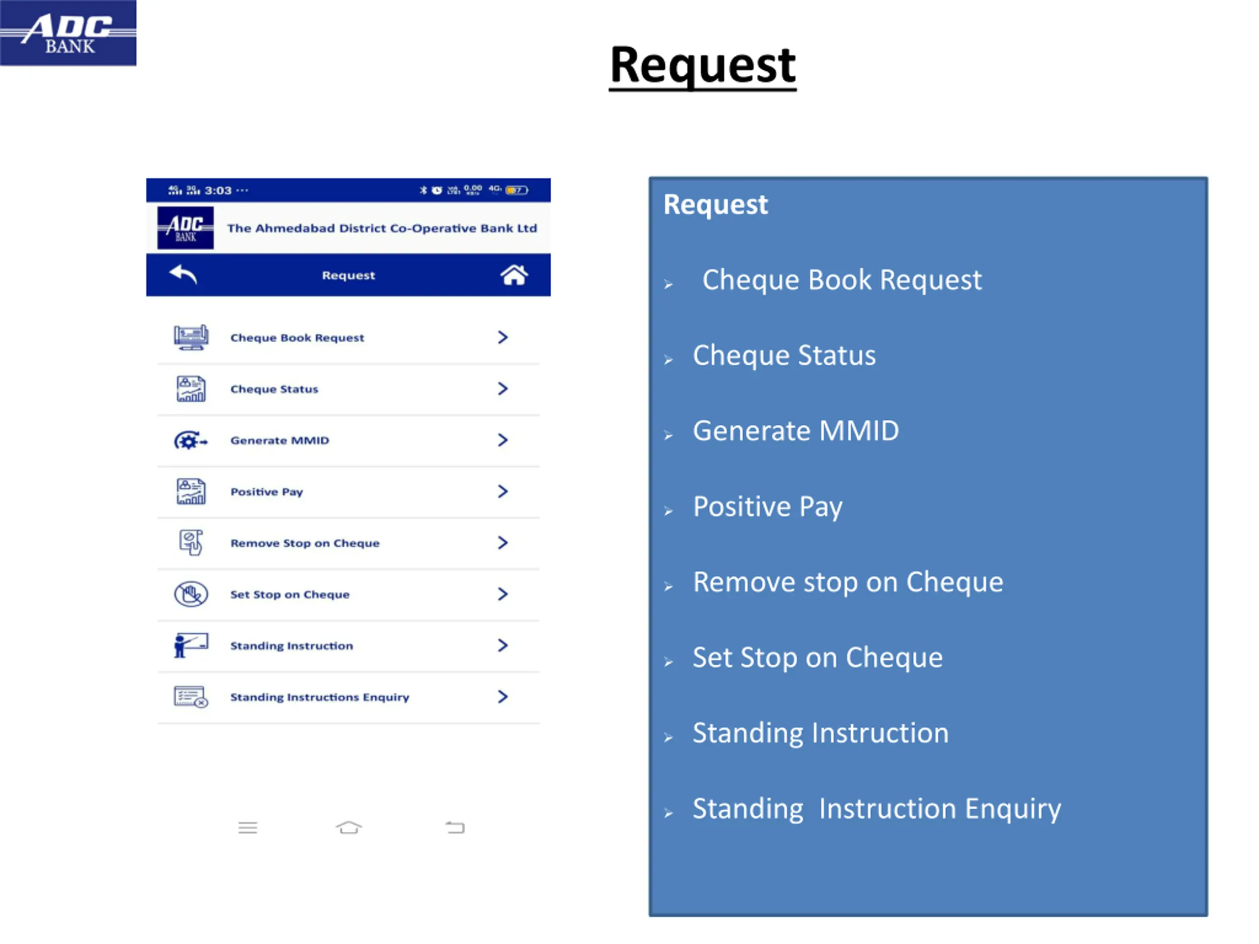 Request Request Cheque Book Request Cheque Status Generate MMID Positive Pay Remove stop on Cheque Set Stop on Cheque Standing Instruction Standing Instruction Enquiry