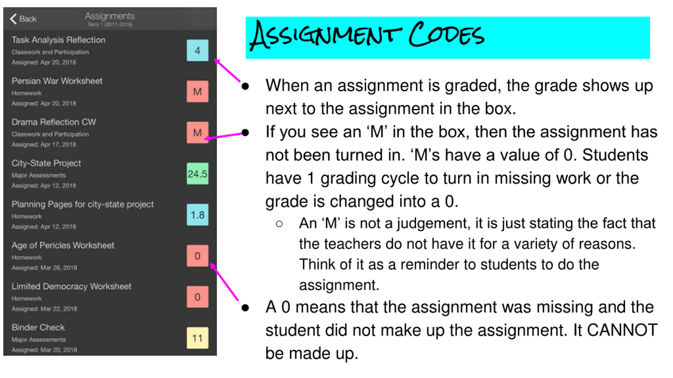 Assignment Codes When an assignment is graded, the grade shows up next to the assignment in the box. If you see an M in the box, then the assignment has not been turned in. M s have a value of 0. Students have 1 grading cycle to turn in missing work or the grade is changed into a 0. An M is not a judgement, it is just stating the fact that the teachers do not have it for a variety of reasons. Think of it as a reminder to students to do the assignment. A 0 means that the assignment was missing and the student did not make up the assignment. It CANNOT be made up.