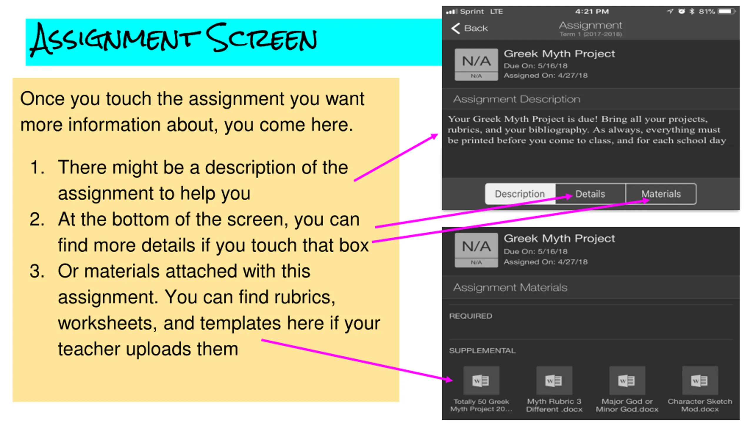 Assignment Screen Once you touch the assignment you want more information about, you come here. 1. There might be a description of the assignment to help you 2. At the bottom of the screen, you can find more details if you touch that box 3. Or materials attached with this assignment. You can find rubrics, worksheets, and templates here if your teacher uploads them