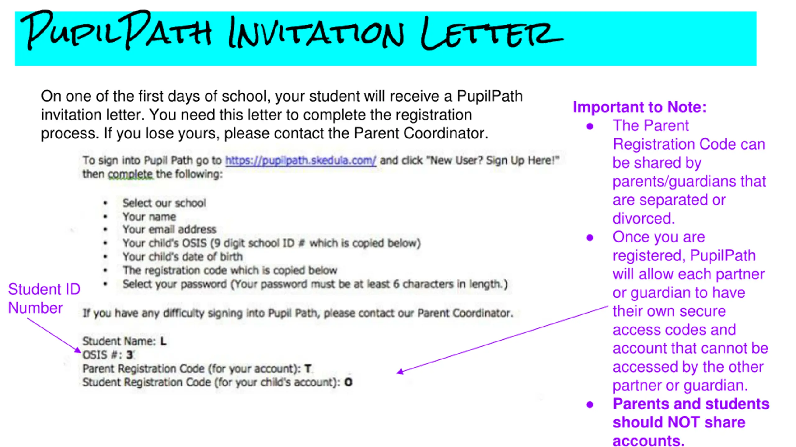 PupilPath Invitation Letter On one of the first days of school, your student will receive a PupilPath invitation letter. You need this letter to complete the registration process. If you lose yours, please contact the Parent Coordinator. Important to Note: The Parent Registration Code can be shared by parents/guardians that are separated or divorced. Once you are registered, PupilPath will allow each partner or guardian to have their own secure access codes and account that cannot be accessed by the other partner or guardian. Parents and students should NOT share accounts. Student ID Number