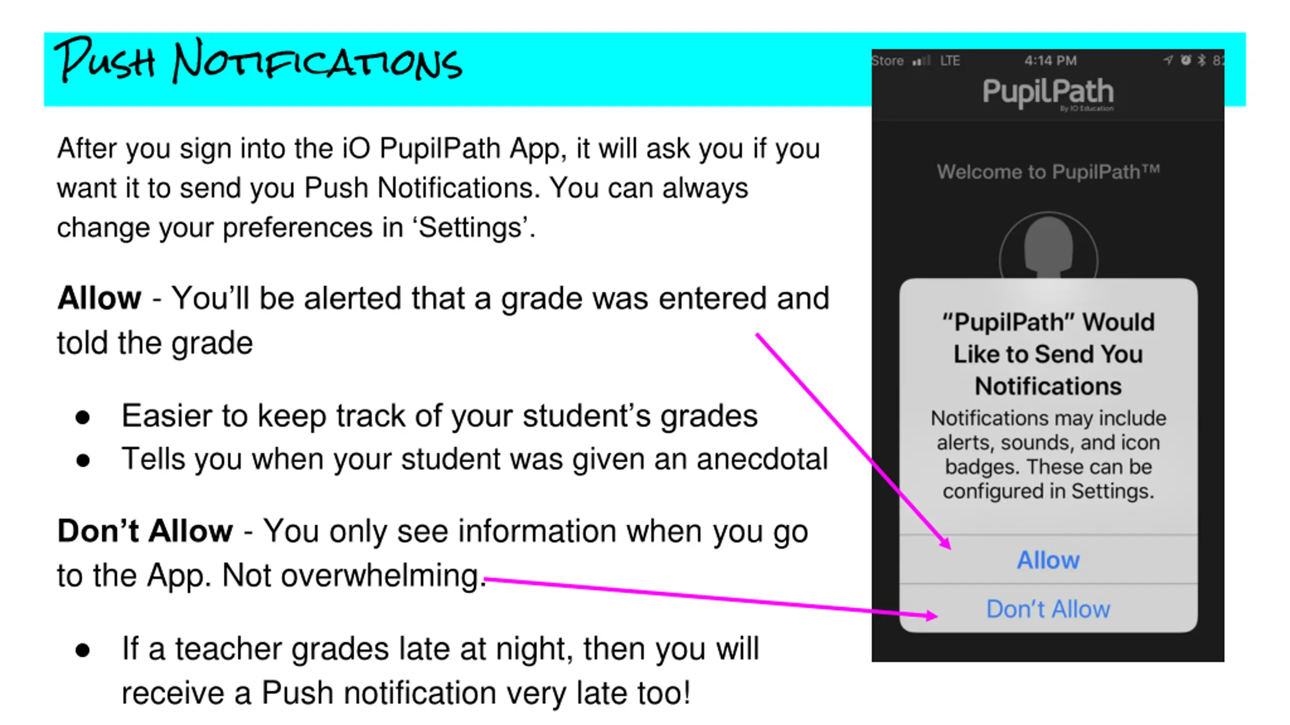 Push Notifications After you sign into the iO PupilPath App, it will ask you if you want it to send you Push Notifications. You can always change your preferences in Settings . Allow - You ll be alerted that a grade was entered and told the grade Easier to keep track of your student s grades Tells you when your student was given an anecdotal Don t Allow - You only see information when you go to the App. Not overwhelming. If a teacher grades late at night, then you will receive a Push notification very late too!