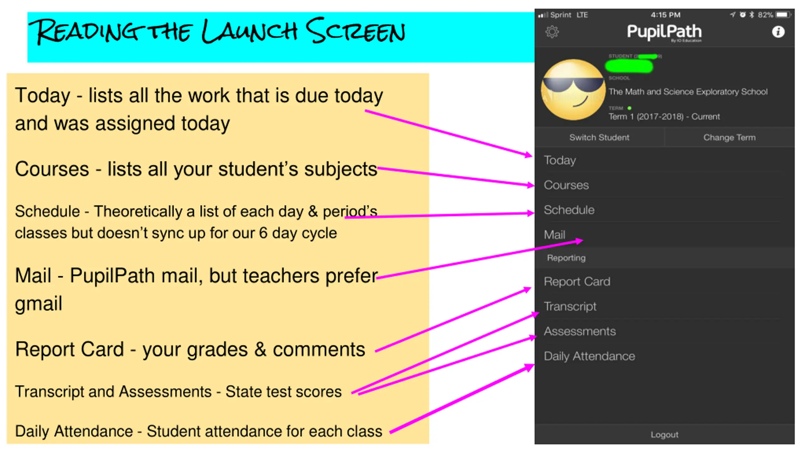 Reading the Launch Screen Today - lists all the work that is due today and was assigned today Courses - lists all your student s subjects Schedule - Theoretically a list of each day & period s classes but doesn t sync up for our 6 day cycle Mail - PupilPath mail, but teachers prefer gmail Report Card - your grades & comments Transcript and Assessments - State test scores Daily Attendance - Student attendance for each class