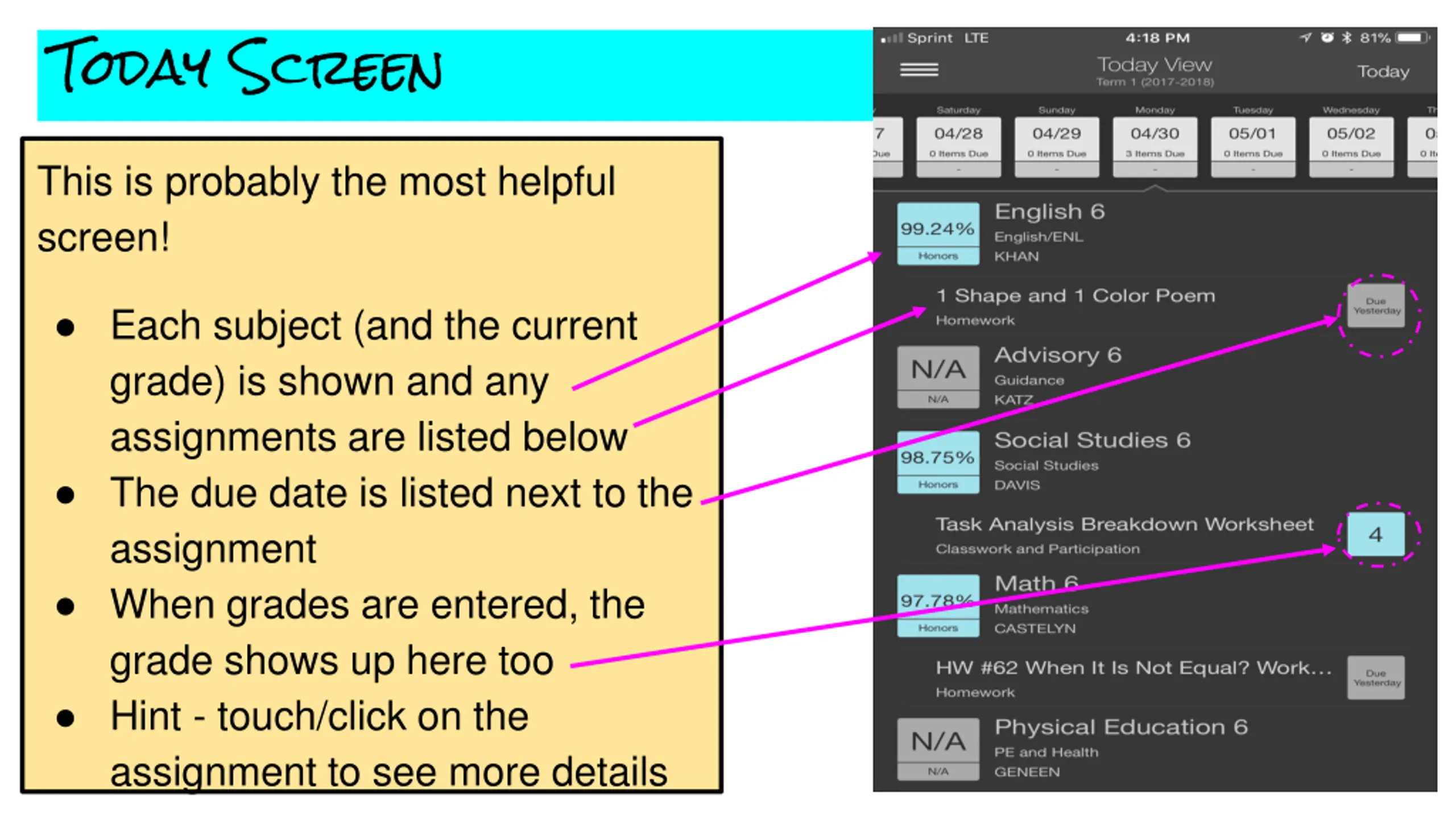 Today Screen This is probably the most helpful screen! Each subject (and the current grade) is shown and any assignments are listed below The due date is listed next to the assignment When grades are entered, the grade shows up here too Hint - touch/click on the assignment to see more details