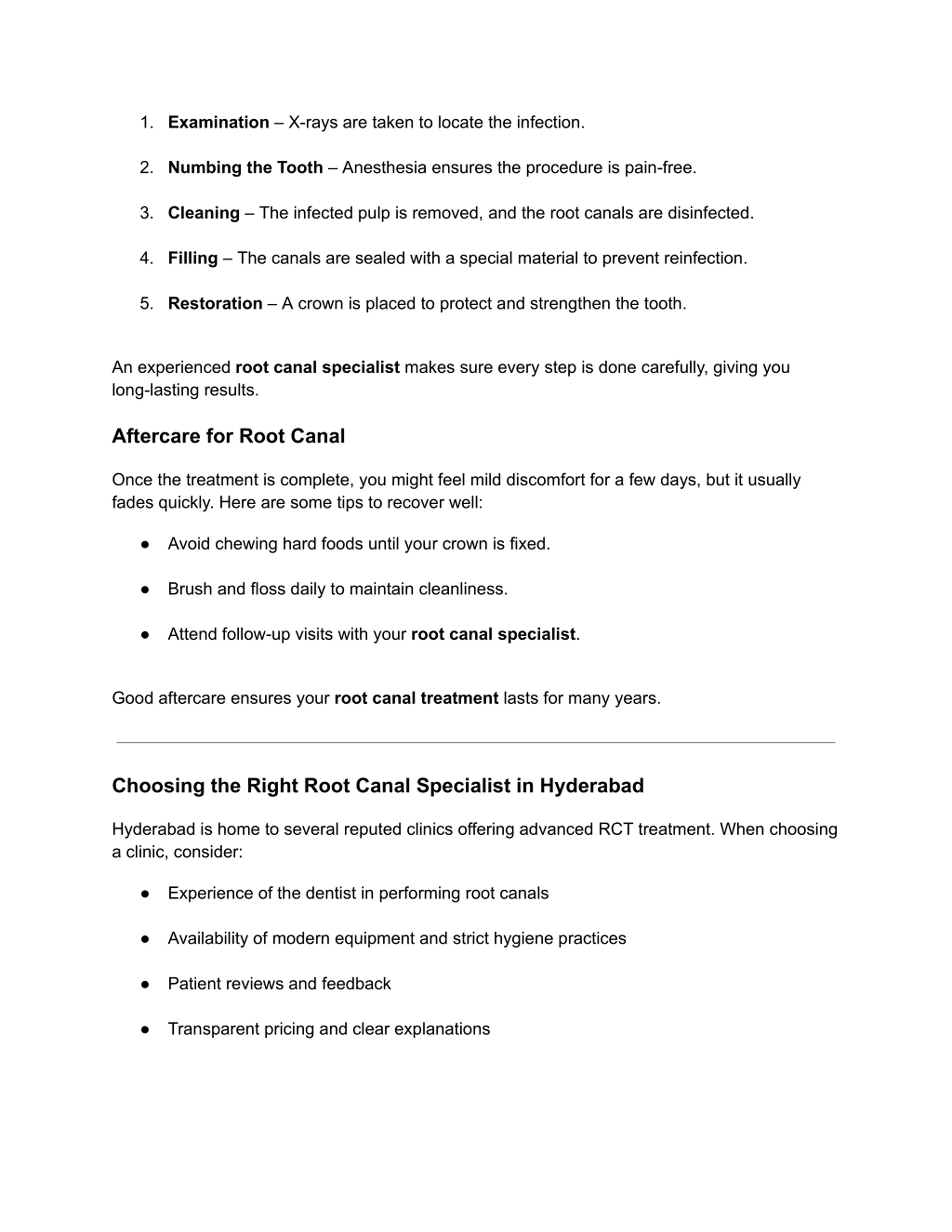 1. Examination X-rays are taken to locate the infection. 2. Numbing the Tooth Anesthesia ensures the procedure is pain-free. 3. Cleaning The infected pulp is removed, and the root canals are disinfected. 4. Filling The canals are sealed with a special material to prevent reinfection. 5. Restoration A crown is placed to protect and strengthen the tooth. An experienced root canal specialist makes sure every step is done carefully, giving you long-lasting results. Aftercare for Root Canal Once the treatment is complete, you might feel mild discomfort for a few days, but it usually fades quickly. Here are some tips to recover well: Avoid chewing hard foods until your crown is fixed. Brush and floss daily to maintain cleanliness. Attend follow-up visits with your root canal specialist . Good aftercare ensures your root canal treatment lasts for many years. Choosing the Right Root Canal Specialist in Hyderabad Hyderabad is home to several reputed clinics offering advanced RCT treatment. When choosing a clinic, consider: Experience of the dentist in performing root canals Availability of modern equipment and strict hygiene practices Patient reviews and feedback Transparent pricing and clear explanations