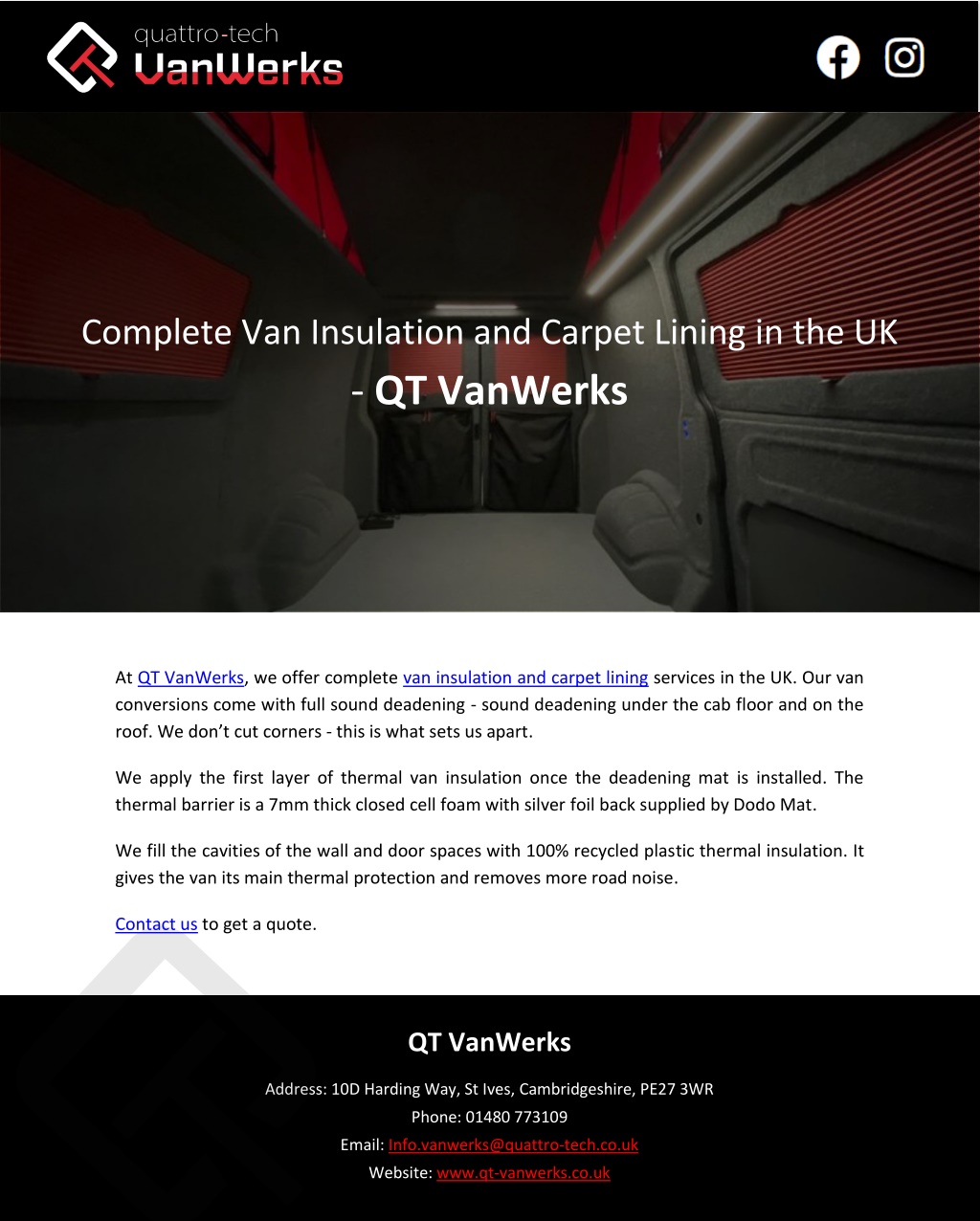 Complete Van Insulation and Carpet Lining in the UK - QT VanWerks At QT VanWerks, we offer complete van insulation and carpet lining services in the UK. Our van conversions come with full sound deadening - sound deadening under the cab floor and on the roof. We don t cut corners - this is what sets us apart. We apply the first layer of thermal van insulation once the deadening mat is installed. The thermal barrier is a 7mm thick closed cell foam with silver foil back supplied by Dodo Mat. We fill the cavities of the wall and door spaces with 100% recycled plastic thermal insulation. It gives the van its main thermal protection and removes more road noise. Contact us to get a quote. QT VanWerks Address: 10D Harding Way, St Ives, Cambridgeshire, PE27 3WR Phone: 01480 773109 Email: Info.vanwerks@quattro-tech.co.uk Website: www.qt-vanwerks.co.uk