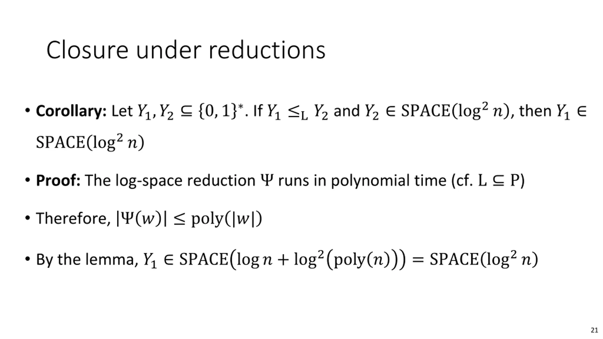 Composing space-bounded algorithms Lemma: ? ? is computable in space ? ??? + ?? ? How much space did we use? ?? ? space used by simulated ?? ??? space used by simulated ?? ? log ? space to keep track of the location of ?? s input-tape head and ?? s output-tape head 20