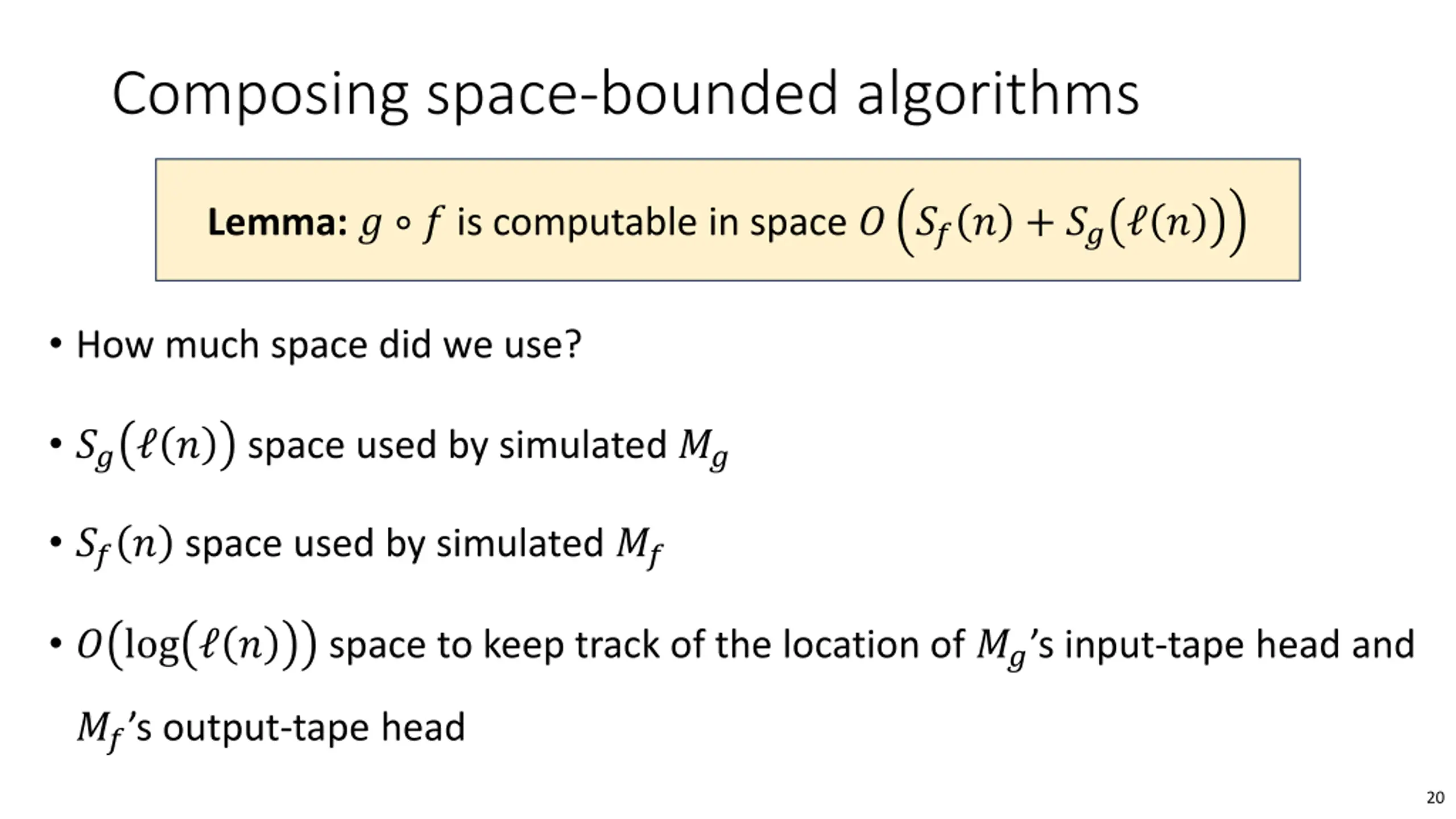 Composing space-bounded algorithms Lemma: ? ? is computable in space ? ??? + ?? ? Let ??, ?? be the TMs that compute ?,?. Our job is to simulate ?? on ? ? Key challenge: We cannot afford to write ? ? down! We remember the location of ?? s input-tape head, ?, in our work space To simulate a single step of ??, first we need to compute ? ?? To compute it, we simulate ?? on ? and discard all but ?-th output symbol! 19