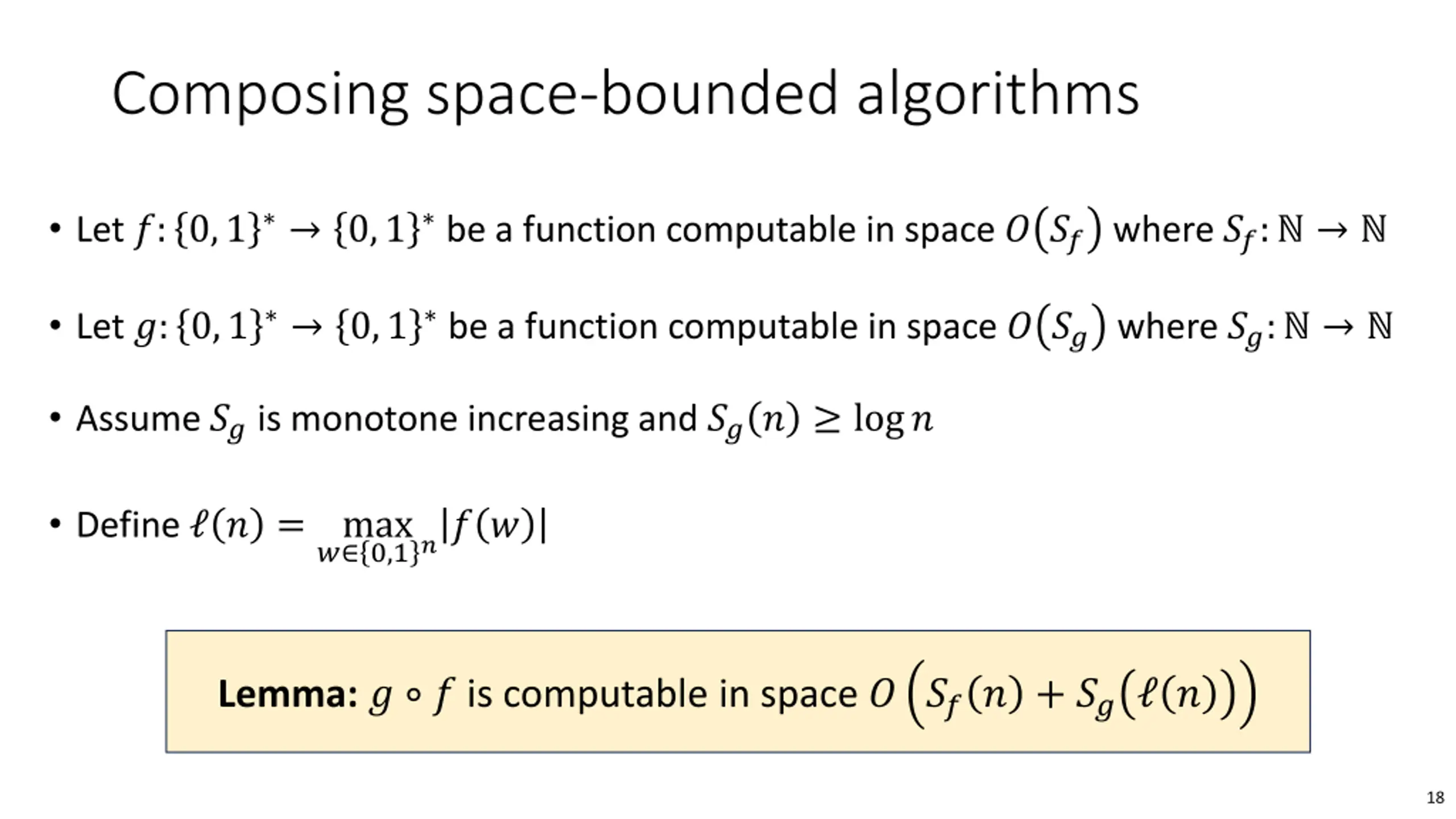 Composing space-bounded algorithms Let ?: 0,1 0,1 be a function computable in space ? ?? where ??: Let ?: 0,1 0,1 be a function computable in space ? ?? where ??: Assume ?? is monotone increasing and ??? log? Define ? = max ? 0,1?? ? Lemma: ? ? is computable in space ? ??? + ?? ? 18