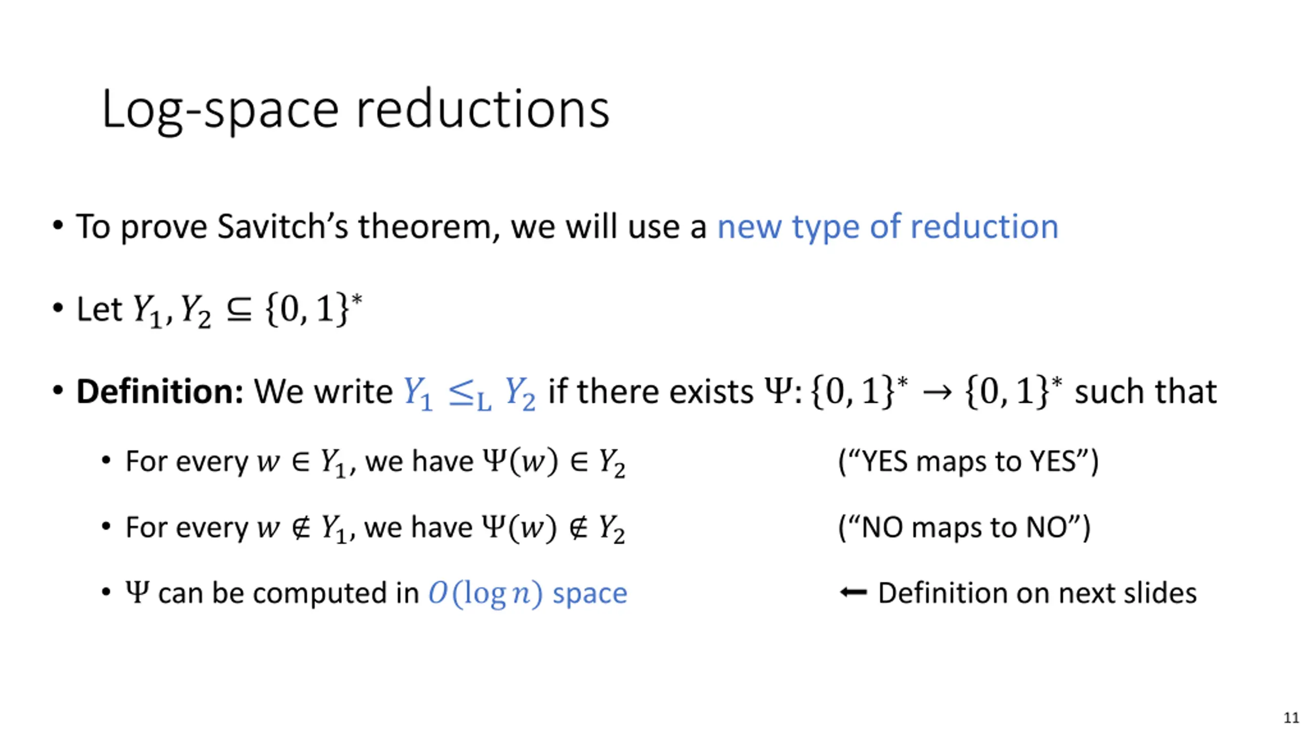 Log-space reductions To prove Savitch s theorem, we will use a new type of reduction Let ?1,?2 0,1 Definition: We write ?1 L?2 if there exists : 0,1 0,1 such that For every ? ?1, we have ? ?2 ( YES maps to YES ) For every ? ?1, we have (?) ?2 ( NO maps to NO ) can be computed in ?(log?) space Definition on next slides 11