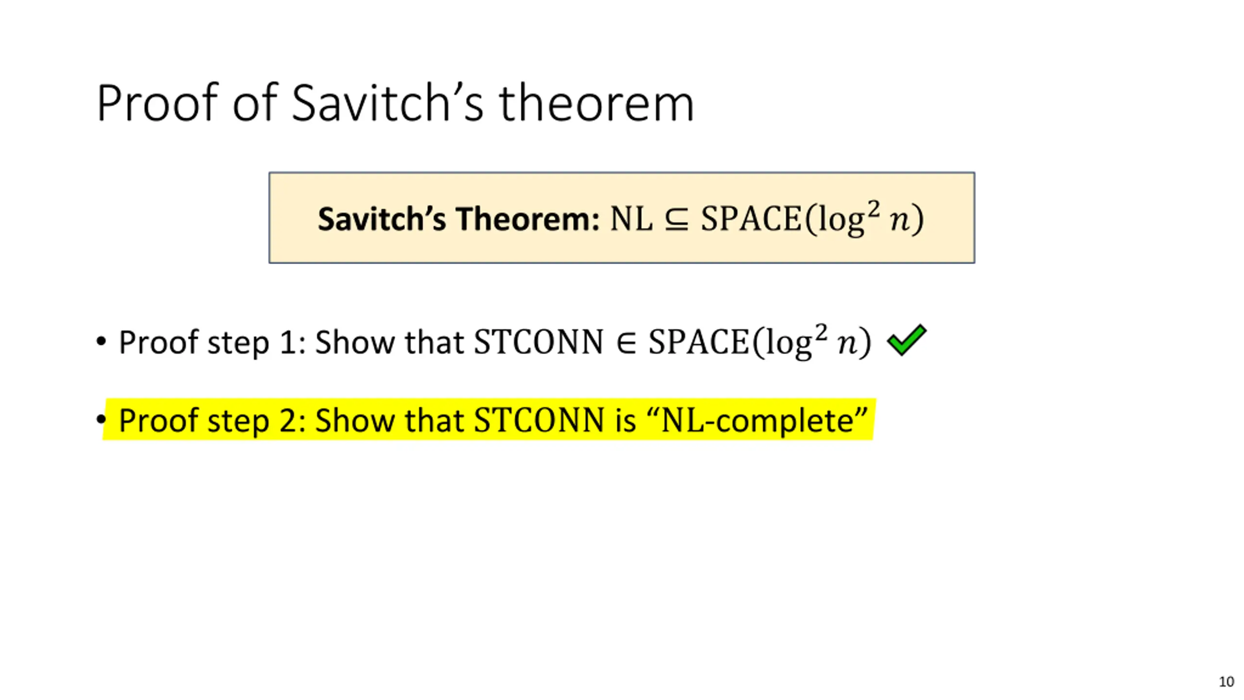 Savitchs algorithm Claim (Savitch s algorithm): STCONN SPACE log2? Proof sketch: Let s figure out: is there a path from ? to ? of length at most 2?? 1. For all ? ?: Recursively figure out whether there is a path from ? to ? of length at most 2? 1 a) Recursively figure out whether there is a path from ? to ? of length at most 2? 1 b) c) If both such paths exist, halt and accept 2. Halt and reject Space complexity is ? ?log? , which is ? log2? when ? = log ? 9
