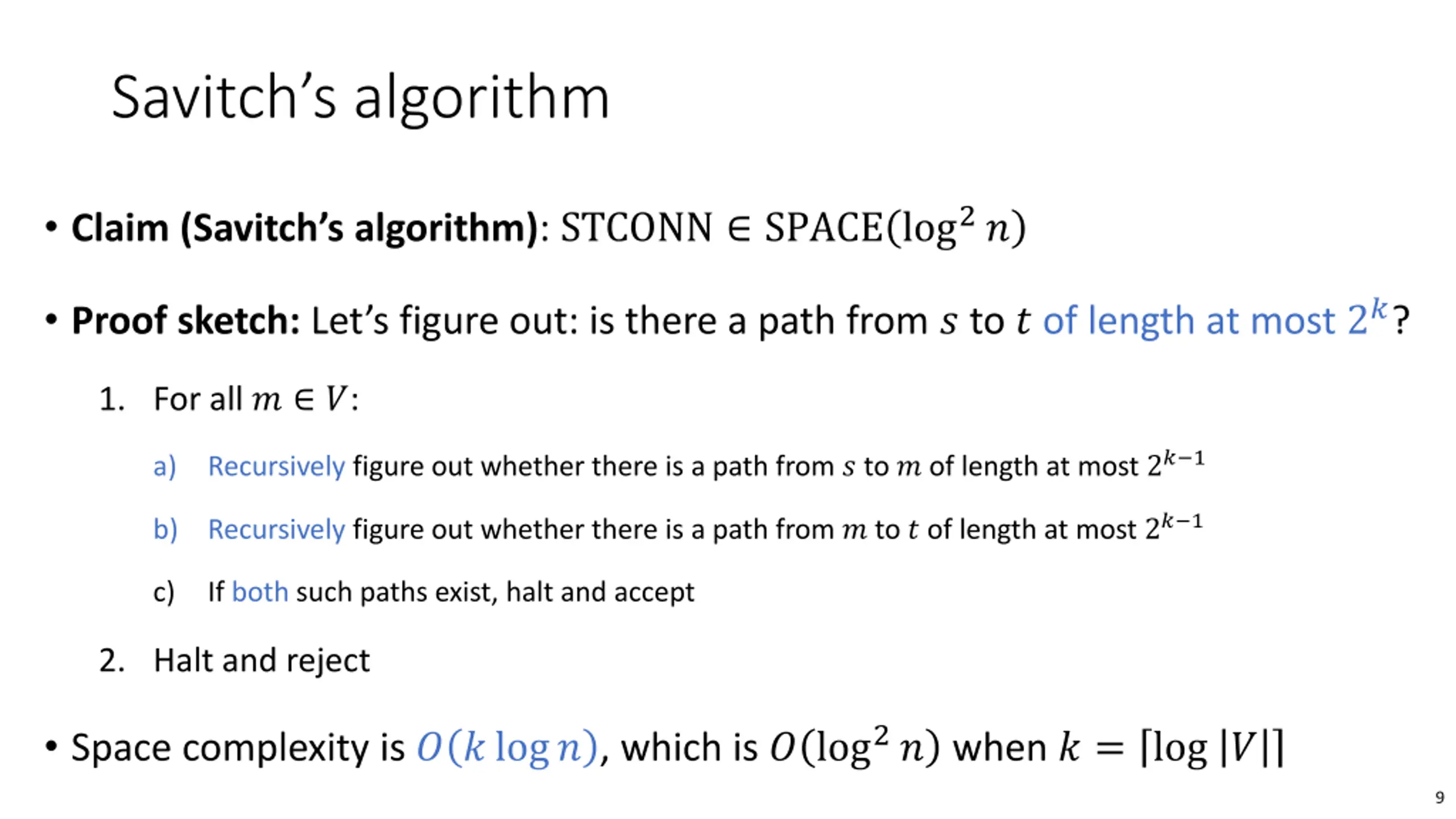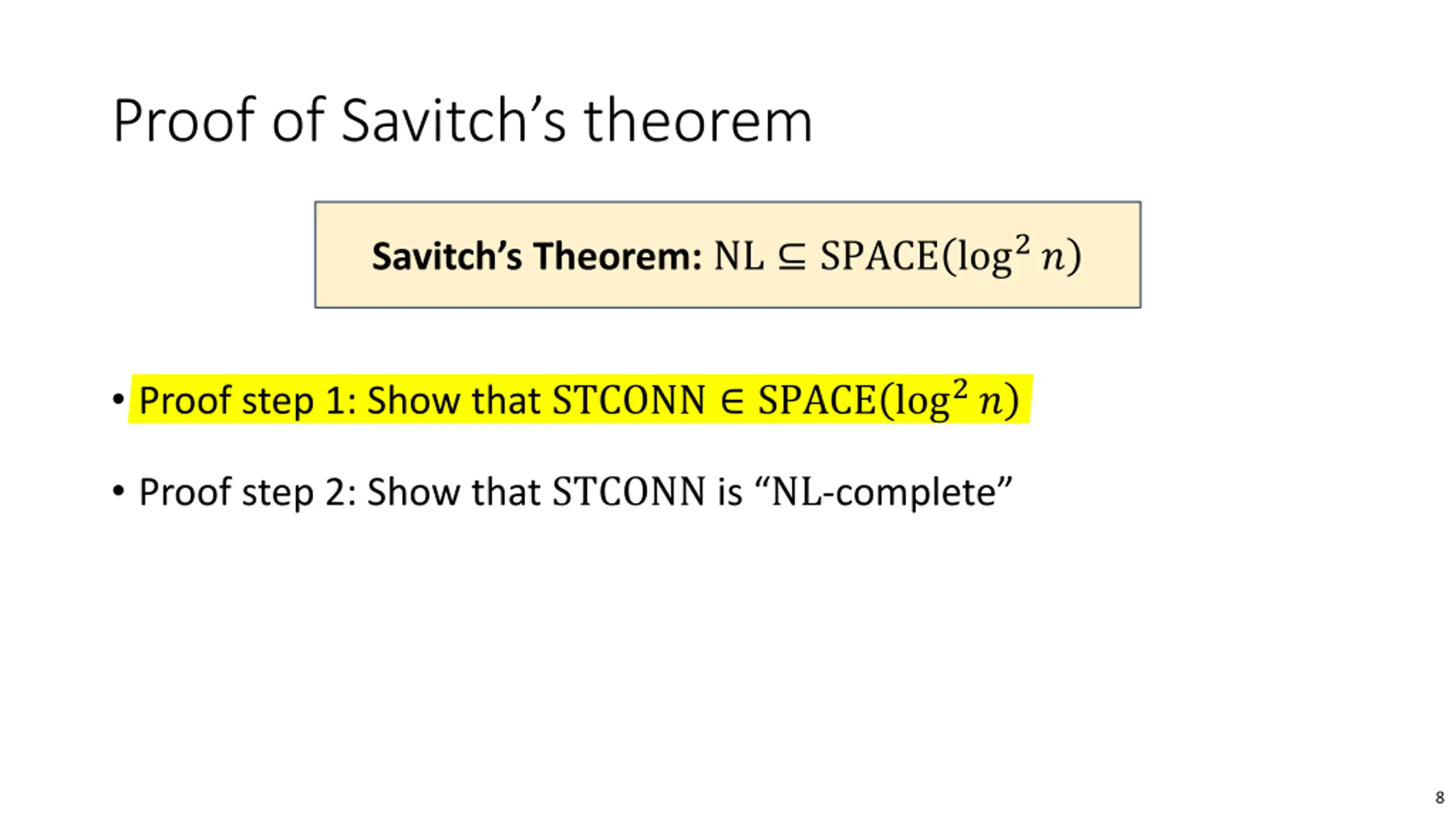 Proof of Savitchs theorem Savitch s Theorem: NL SPACE log2? Proof step 1: Show that STCONN SPACE log2? Proof step 2: Show that STCONNis NL-complete 8