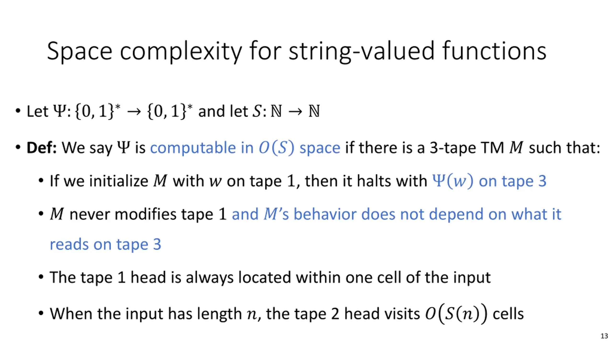 Space complexity for string-valued functions Let : 0,1 0,1 and let ?: Def: We say is computable in ? ? space if there is a 3-tape TM ? such that: If we initialize ? with ? on tape 1, then it halts with ? on tape 3 ? never modifies tape 1 and ? s behavior does not depend on what it reads on tape 3 The tape 1 head is always located within one cell of the input When the input has length ?, the tape 2 head visits ? ? ? cells 13