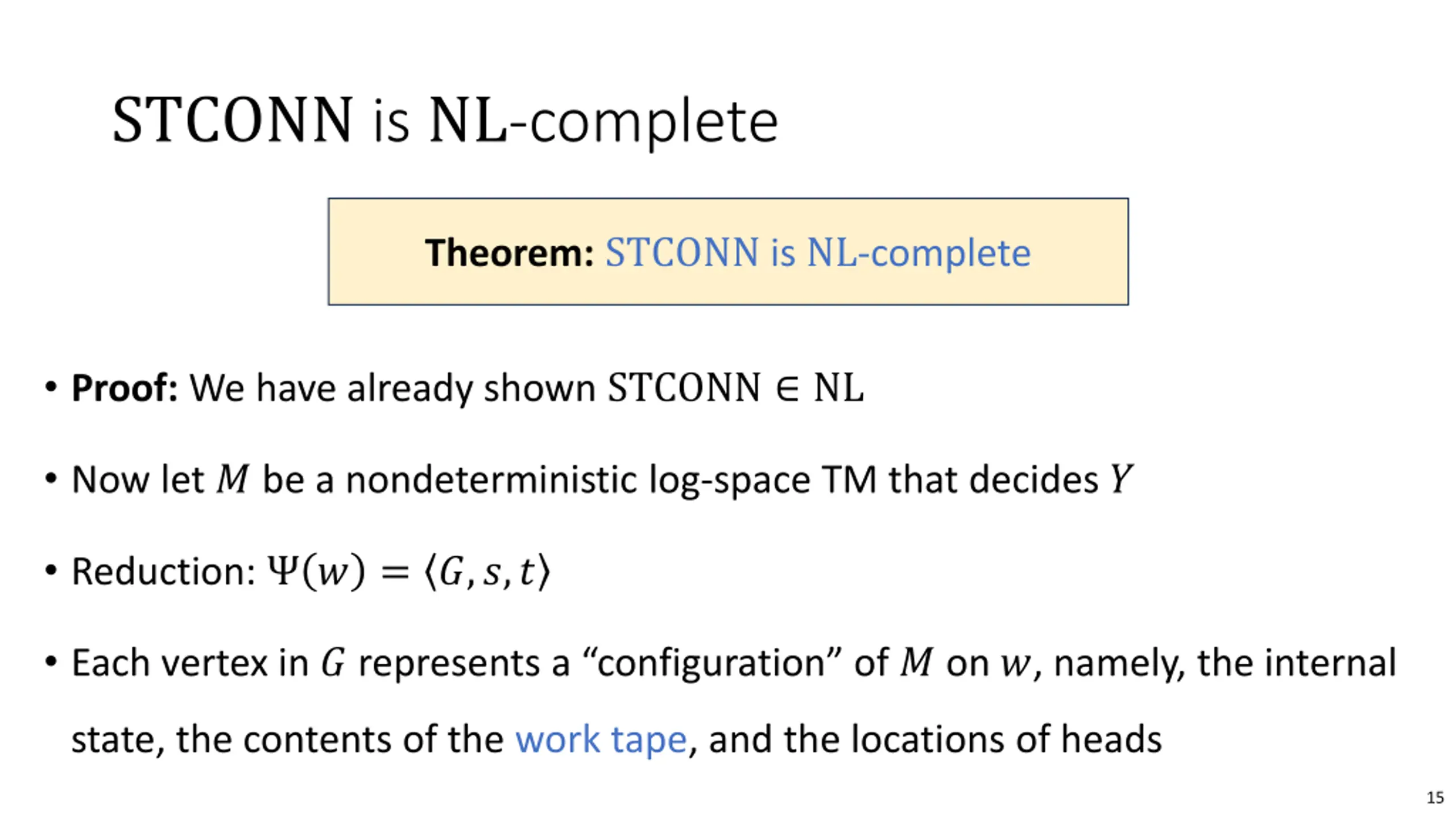 STCONN is NL-complete Theorem: STCONN is NL-complete Proof: We have already shown STCONN NL Now let ? be a nondeterministic log-space TM that decides ? Reduction: ? = ?,?,? Each vertex in ?represents a configuration of ? on ?, namely, the internal state, the contents of the work tape, and the locations of heads 15