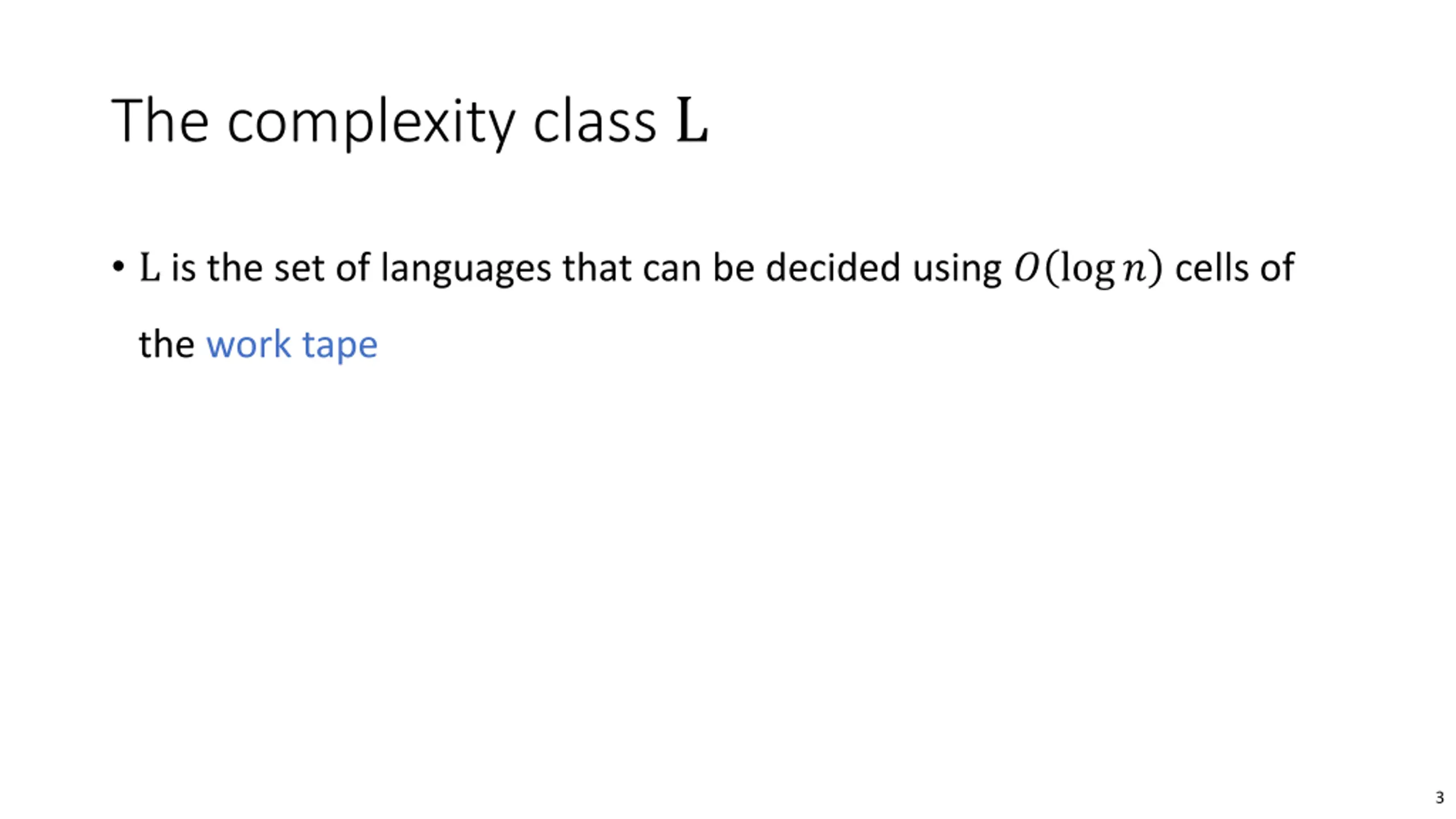 The complexity class L L is the set of languages that can be decided using ? log? cells of the work tape 3