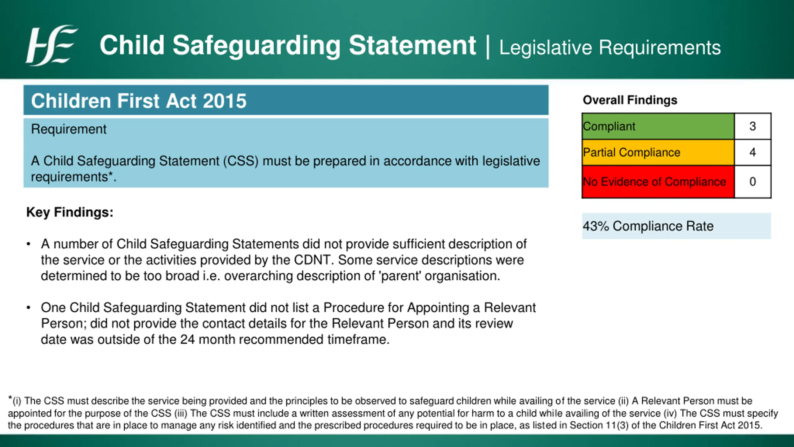 Child Safeguarding Statement | Review Children First Act 2015 Overall Findings 4 Compliant Requirement 1 Partial Compliance A provider of a relevant service shall review a Child Safeguarding Statement at intervals of not more than 24 months or as soon as practicable after there has been a material change in any matter to which the statement refers. 2 No Evidence of Compliance 57% Compliance Rate Key Findings: There was no evidence that Child Safeguarding Statements had been reviewed within 24 months. A material change to which one Statement referred was not recognised as such and the Statement was not reviewed accordingly i.e. procedures named on the CSS were no longer available.