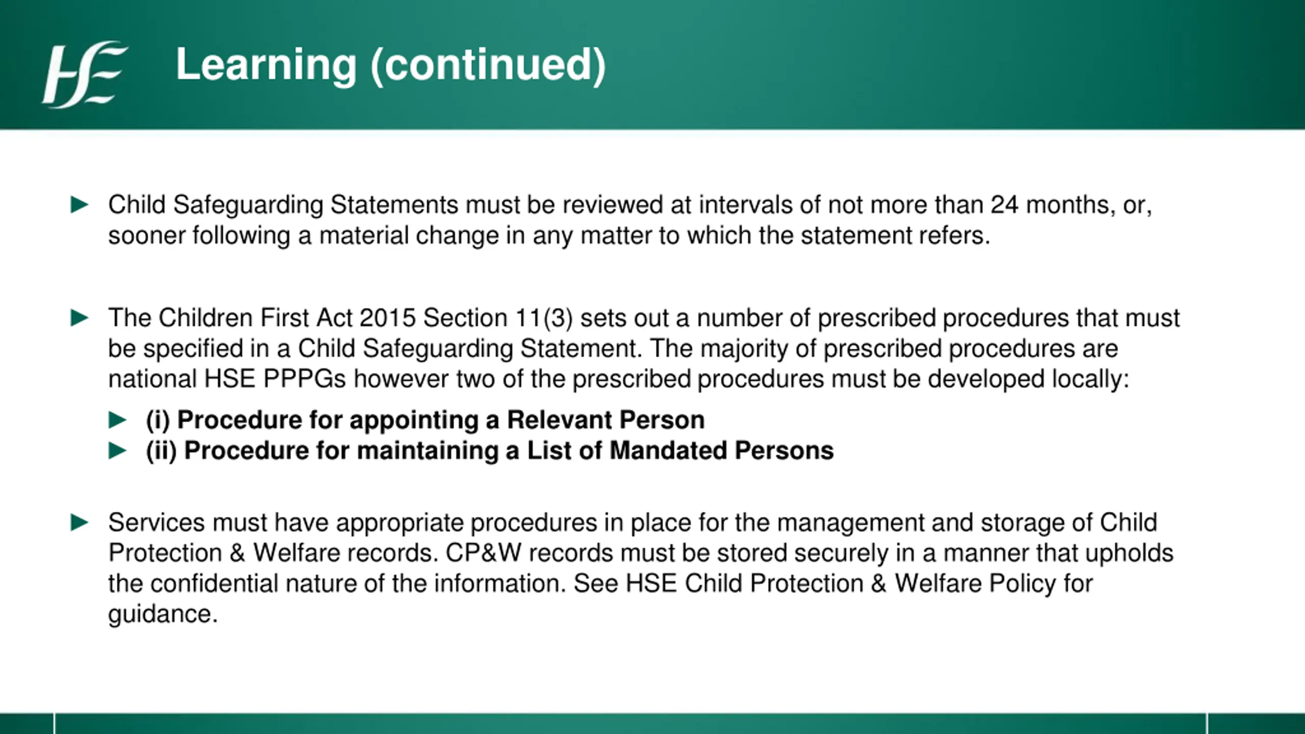 Learning (continued) Child Safeguarding Statements must be reviewed at intervals of not more than 24 months, or, sooner following a material change in any matter to which the statement refers. The Children First Act 2015 Section 11(3) sets out a number of prescribed procedures that must be specified in a Child Safeguarding Statement. The majority of prescribed procedures are national HSE PPPGs however two of the prescribed procedures must be developed locally: (i) Procedure for appointing a Relevant Person (ii) Procedure for maintaining a List of Mandated Persons Services must have appropriate procedures in place for the management and storage of Child Protection & Welfare records. CP&W records must be stored securely in a manner that upholds the confidential nature of the information. See HSE Child Protection & Welfare Policy for guidance.