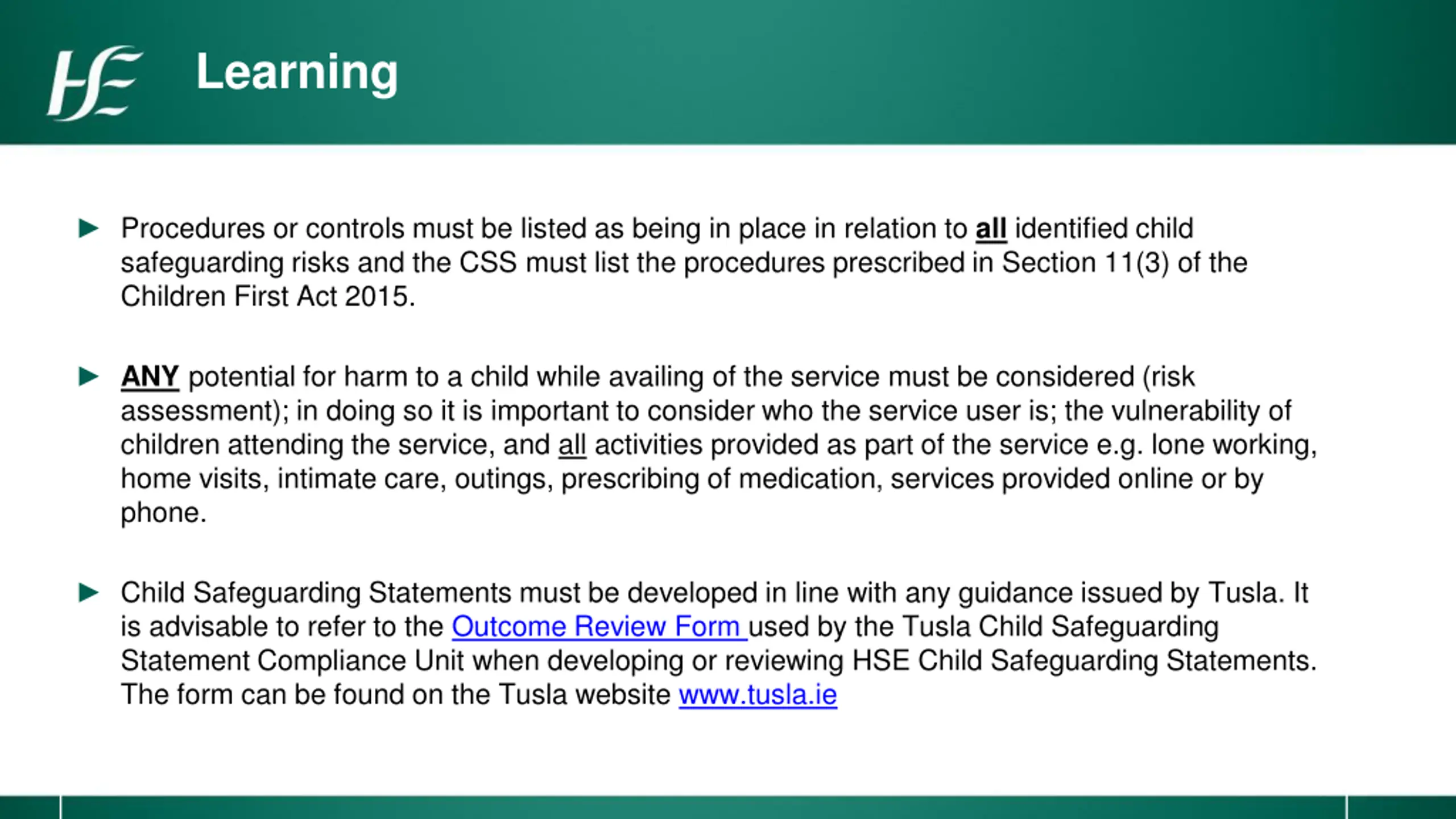 Learning Procedures or controls must be listed as being in place in relation to all identified child safeguarding risks and the CSS must list the procedures prescribed in Section 11(3) of the Children First Act 2015. ANY potential for harm to a child while availing of the service must be considered (risk assessment); in doing so it is important to consider who the service user is; the vulnerability of children attending the service, and all activities provided as part of the service e.g. lone working, home visits, intimate care, outings, prescribing of medication, services provided online or by phone. Child Safeguarding Statements must be developed in line with any guidance issued by Tusla. It is advisable to refer to the Outcome Review Form used by the Tusla Child Safeguarding Statement Compliance Unit when developing or reviewing HSE Child Safeguarding Statements. The form can be found on the Tusla website www.tusla.ie
