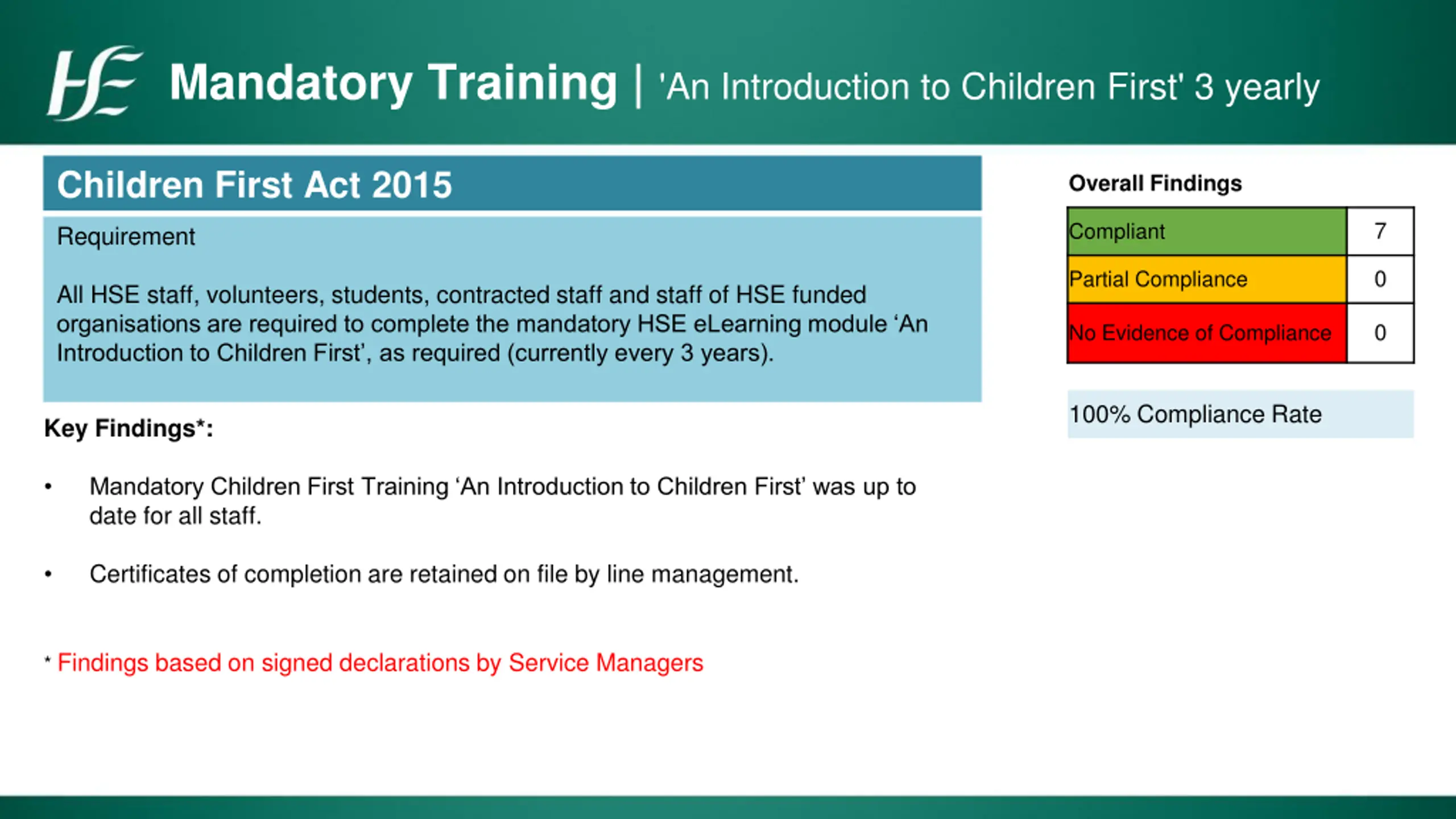 Mandatory Training | 'An Introduction to Children First' 3 yearly Children First Act 2015 Overall Findings 7 Compliant Requirement 0 Partial Compliance All HSE staff, volunteers, students, contracted staff and staff of HSE funded organisations are required to complete the mandatory HSE eLearning module An Introduction to Children First , as required (currently every 3 years). 0 No Evidence of Compliance 100% Compliance Rate Key Findings*: Mandatory Children First Training An Introduction to Children First was up to date for all staff. Certificates of completion are retained on file by line management. * Findings based on signed declarations by Service Managers
