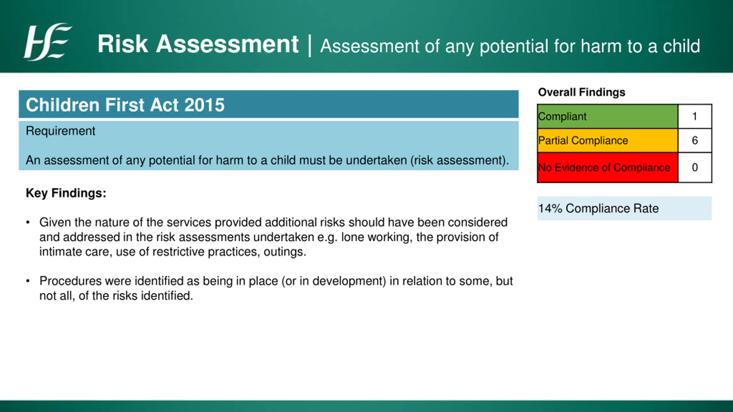 Risk Assessment | Assessment of any potential for harm to a child Overall Findings Children First Act 2015 1 Compliant Requirement 6 Partial Compliance An assessment of any potential for harm to a child must be undertaken (risk assessment). 0 No Evidence of Compliance Key Findings: 14% Compliance Rate Given the nature of the services provided additional risks should have been considered and addressed in the risk assessments undertaken e.g. lone working, the provision of intimate care, use of restrictive practices, outings. Procedures were identified as being in place (or in development) in relation to some, but not all, of the risks identified.