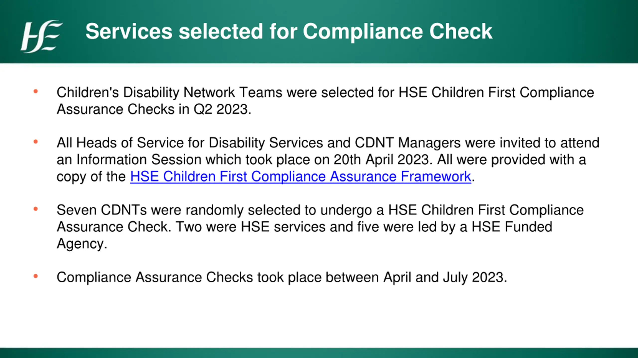 Services selected for Compliance Check Children's Disability Network Teams were selected for HSE Children First Compliance Assurance Checks in Q2 2023. All Heads of Service for Disability Services and CDNT Managers were invited to attend an Information Session which took place on 20th April 2023. All were provided with a copy of the HSE Children First Compliance Assurance Framework. Seven CDNTs were randomly selected to undergo a HSE Children First Compliance Assurance Check. Two were HSE services and five were led by a HSE Funded Agency. Compliance Assurance Checks took place between April and July 2023.