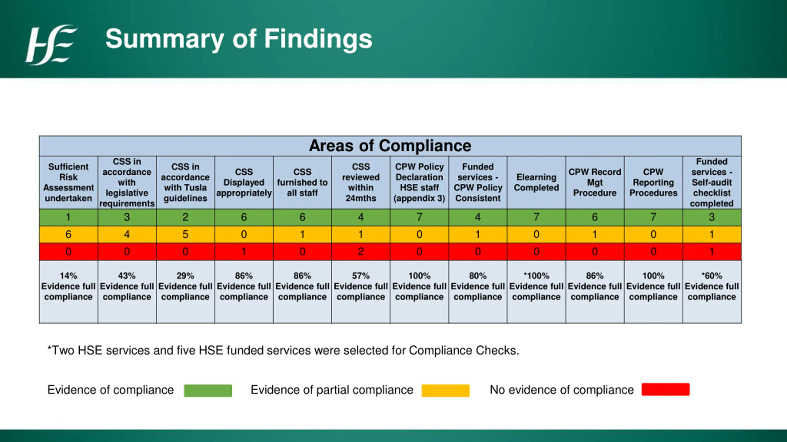 Summary of Findings Areas of Compliance CSS in accordance with legislative requirements 3 4 0 Funded services - Self-audit checklist completed 3 1 1 Sufficient Risk Assessment undertaken CSS in accordance with Tusla guidelines CSS reviewed within 24mths CPW Policy Declaration HSE staff (appendix 3) Funded services - CPW Policy Consistent CSS CSS CPW Record Mgt Procedure CPW Reporting Procedures Elearning Completed Displayed appropriately furnished to all staff 1 6 0 2 5 0 6 0 1 6 1 0 4 1 2 7 0 0 4 1 0 7 0 0 6 1 0 7 0 0 14% 43% 29% 86% 86% 57% 100% 80% *100% 86% 100% *60% Evidence full compliance Evidence full compliance Evidence full compliance Evidence full compliance Evidence full compliance Evidence full compliance Evidence full compliance Evidence full compliance Evidence full compliance Evidence full compliance Evidence full compliance Evidence full compliance *Two HSE services and five HSE funded services were selected for Compliance Checks. Evidence of compliance Evidence of partial compliance No evidence of compliance