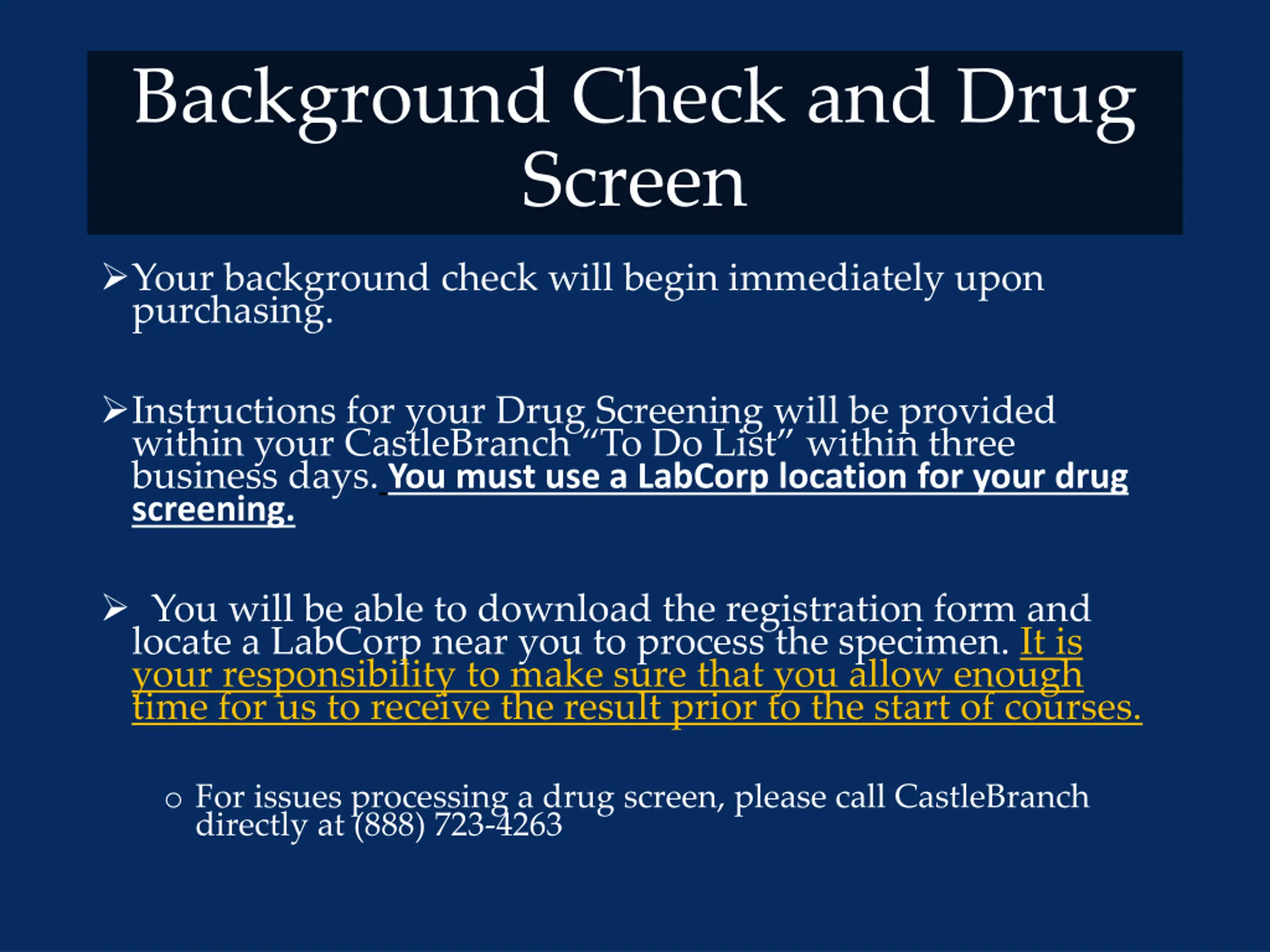 Background Check and Drug Screen Your background check will begin immediately upon purchasing. Instructions for your Drug Screening will be provided within your CastleBranch To Do List within three business days. You must use a LabCorp location for your drug screening. You will be able to download the registration form and locate a LabCorp near you to process the specimen. It is your responsibility to make sure that you allow enough time for us to receive the result prior to the start of courses. o For issues processing a drug screen, please call CastleBranch directly at (888) 723-4263