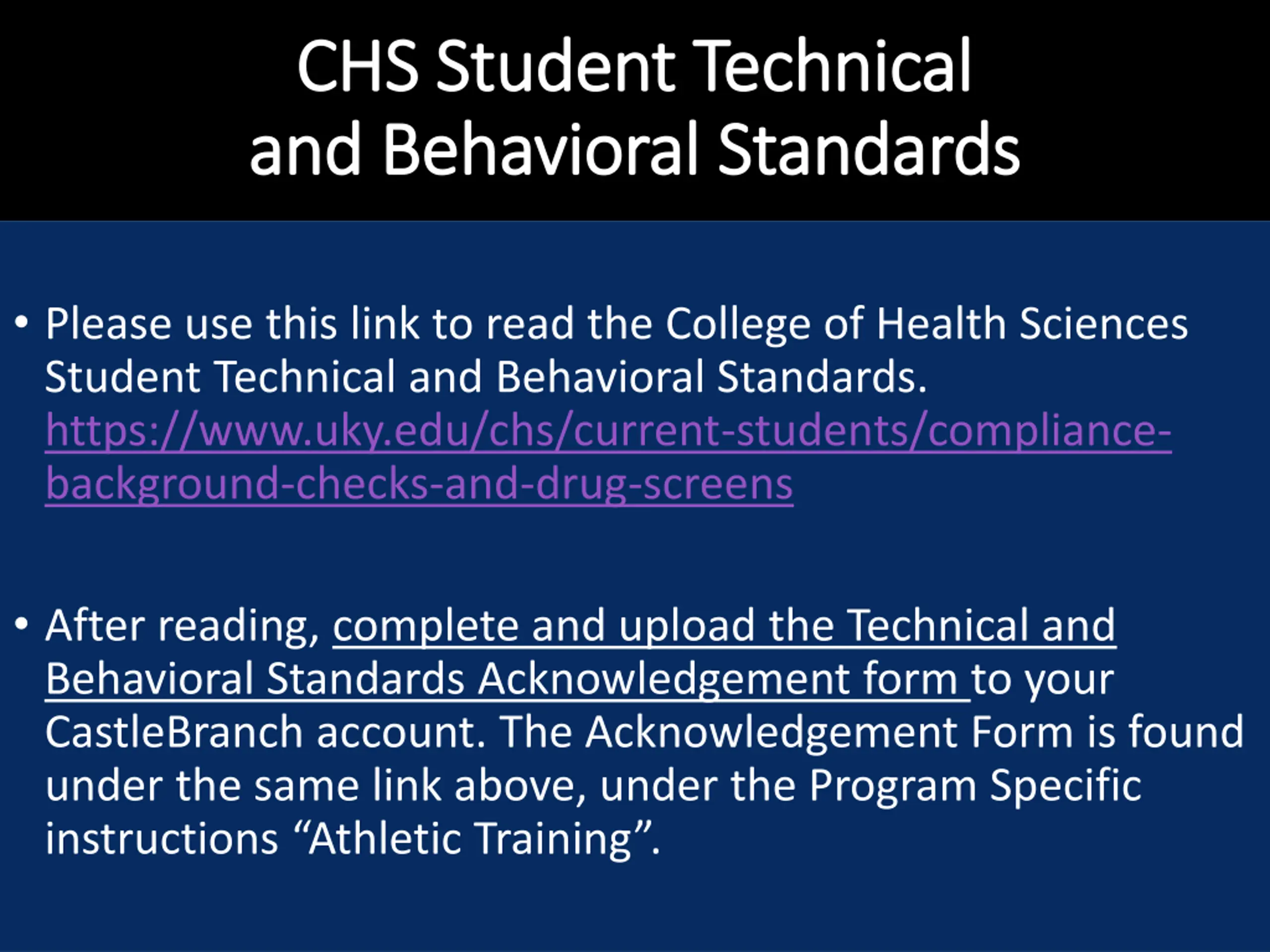 CHS Student Technical CHS Student Technical and Behavioral Standards and Behavioral Standards Please use this link to read the College of Health Sciences Student Technical and Behavioral Standards. https://www.uky.edu/chs/current-students/compliance- background-checks-and-drug-screens After reading, complete and upload the Technical and Behavioral Standards Acknowledgement form to your CastleBranch account. The Acknowledgement Form is found under the same link above, under the Program Specific instructions Athletic Training .