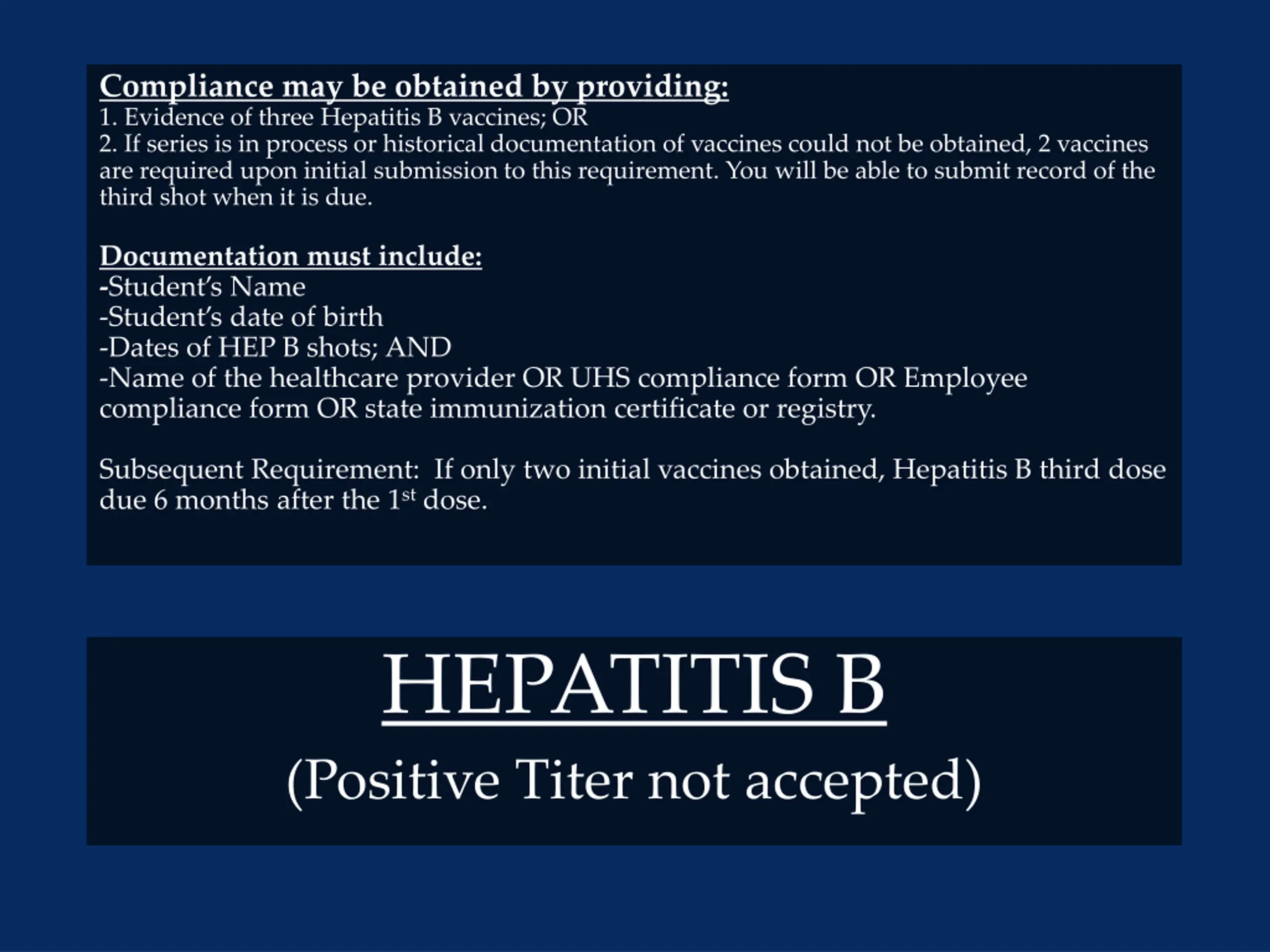 Compliance may be obtained by providing: 1. Evidence of three Hepatitis B vaccines; OR 2. If series is in process or historical documentation of vaccines could not be obtained, 2 vaccines are required upon initial submission to this requirement. You will be able to submit record of the third shot when it is due. Documentation must include: -Student s Name -Student s date of birth -Dates of HEP B shots; AND -Name of the healthcare provider OR UHS compliance form OR Employee compliance form OR state immunization certificate or registry. Subsequent Requirement: If only two initial vaccines obtained, Hepatitis B third dose due 6 months after the 1st dose. HEPATITIS B (Positive Titer not accepted)