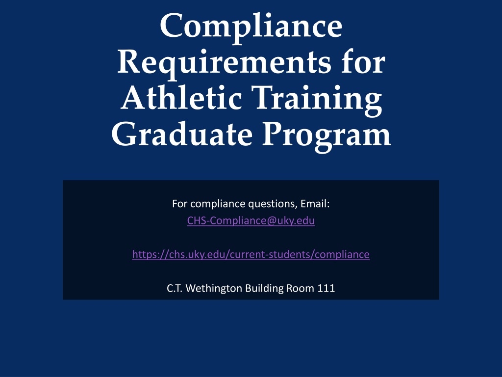 Compliance Requirements for Athletic Training Graduate Program For compliance questions, Email: CHS-Compliance@uky.edu https://chs.uky.edu/current-students/compliance C.T. Wethington Building Room 111