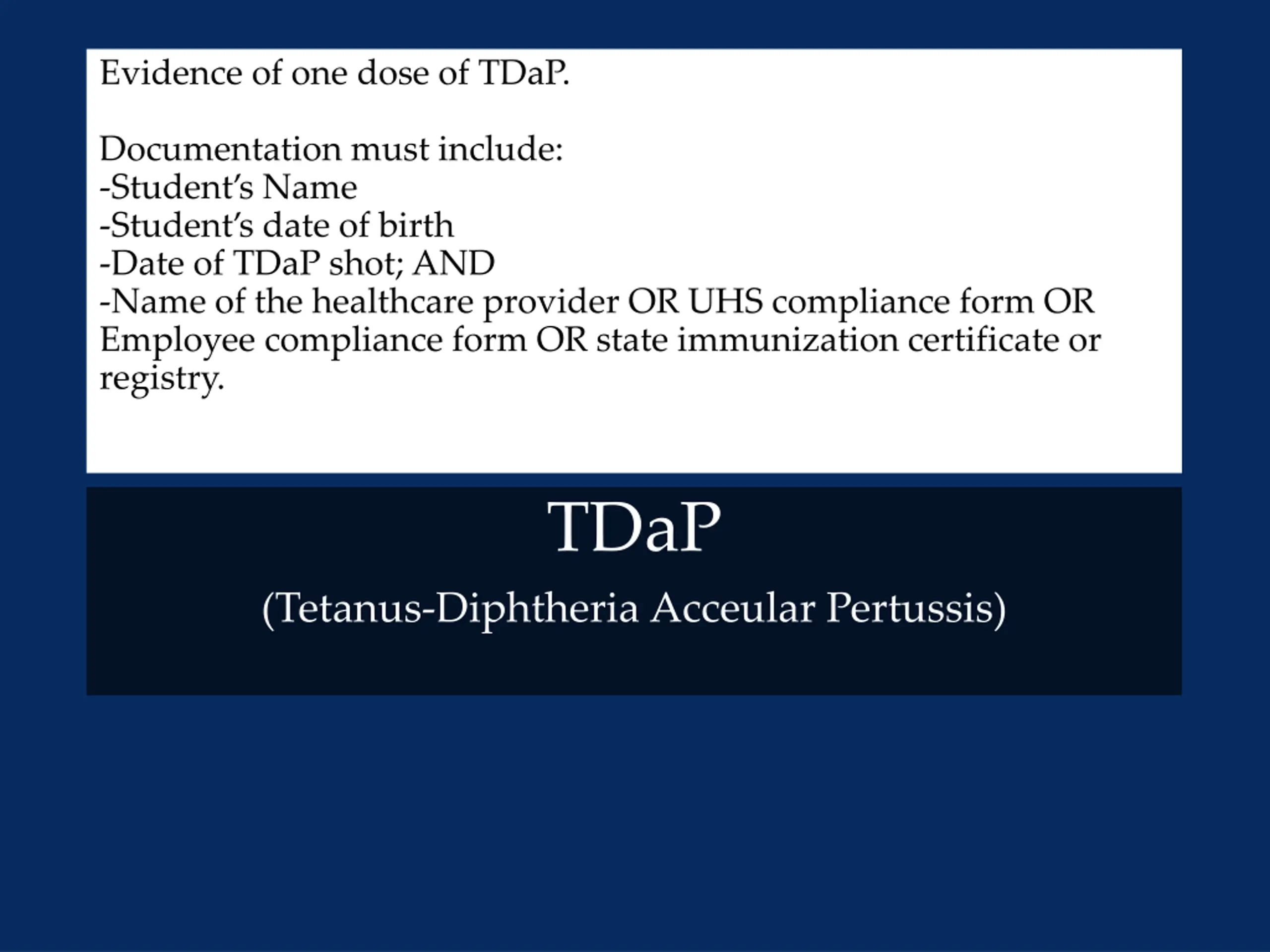 Evidence of one dose of TDaP. Documentation must include: -Student s Name -Student s date of birth -Date of TDaP shot; AND -Name of the healthcare provider OR UHS compliance form OR Employee compliance form OR state immunization certificate or registry. TDaP (Tetanus-Diphtheria Acceular Pertussis)