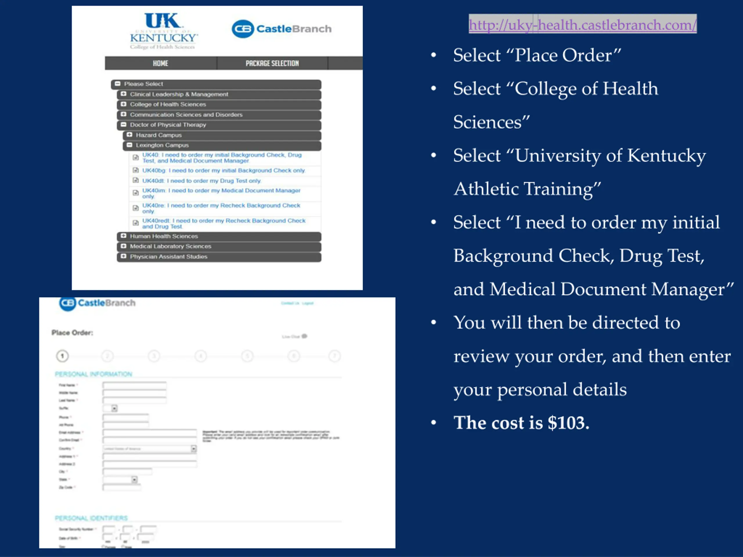 http://uky-health.castlebranch.com/ Select Place Order Select College of Health Sciences Select University of Kentucky Athletic Training Select I need to order my initial Background Check, Drug Test, and Medical Document Manager You will then be directed to review your order, and then enter your personal details The cost is $103.