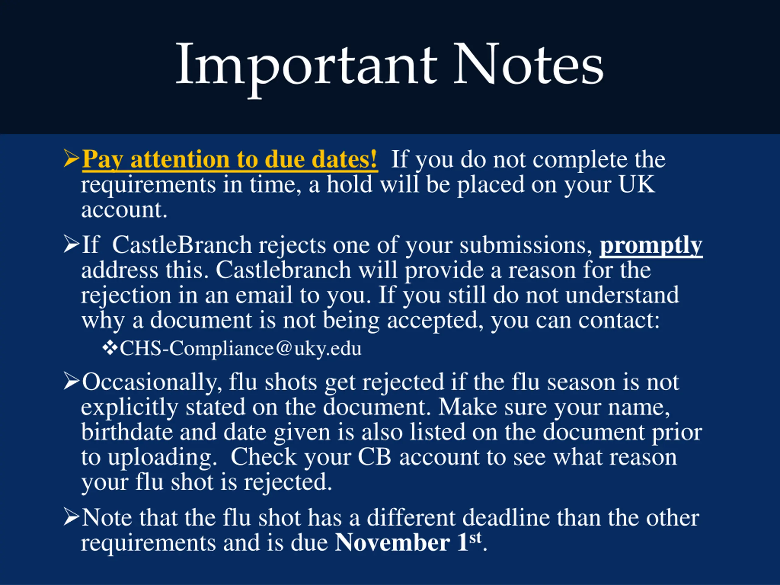 Important Notes Pay attention to due dates! If you do not complete the requirements in time, a hold will be placed on your UK account. If CastleBranch rejects one of your submissions, promptly address this. Castlebranch will provide a reason for the rejection in an email to you. If you still do not understand why a document is not being accepted, you can contact: CHS-Compliance@uky.edu Occasionally, flu shots get rejected if the flu season is not explicitly stated on the document. Make sure your name, birthdate and date given is also listed on the document prior to uploading. Check your CB account to see what reason your flu shot is rejected. Note that the flu shot has a different deadline than the other requirements and is due November 1st.