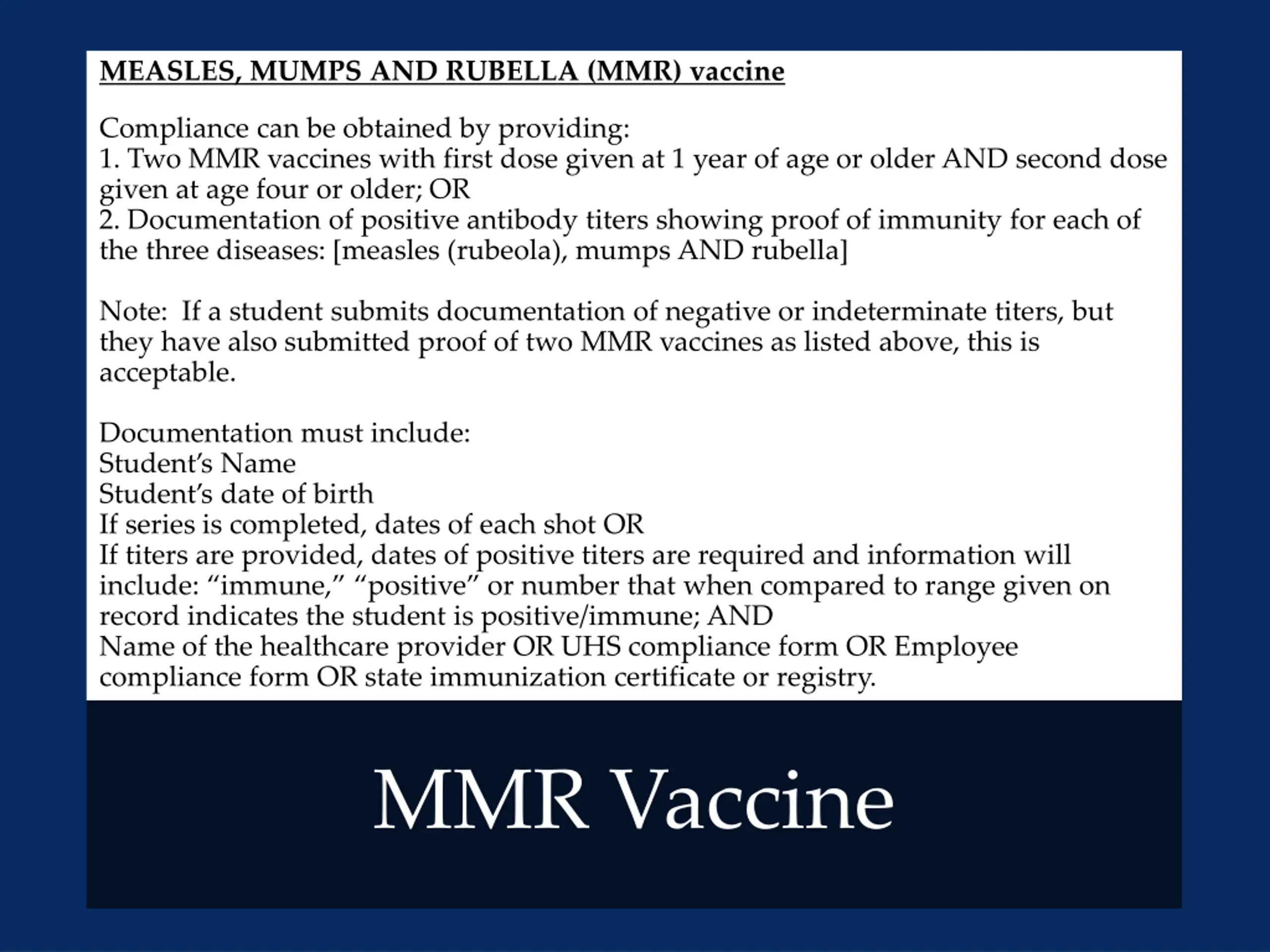 MEASLES, MUMPS AND RUBELLA (MMR) vaccine Compliance can be obtained by providing: 1. Two MMR vaccines with first dose given at 1 year of age or older AND second dose given at age four or older; OR 2. Documentation of positive antibody titers showing proof of immunity for each of the three diseases: [measles (rubeola), mumps AND rubella] Note: If a student submits documentation of negative or indeterminate titers, but they have also submitted proof of two MMR vaccines as listed above, this is acceptable. Documentation must include: Student s Name Student s date of birth If series is completed, dates of each shot OR If titers are provided, dates of positive titers are required and information will include: immune, positive or number that when compared to range given on record indicates the student is positive/immune; AND Name of the healthcare provider OR UHS compliance form OR Employee compliance form OR state immunization certificate or registry. MMR Vaccine