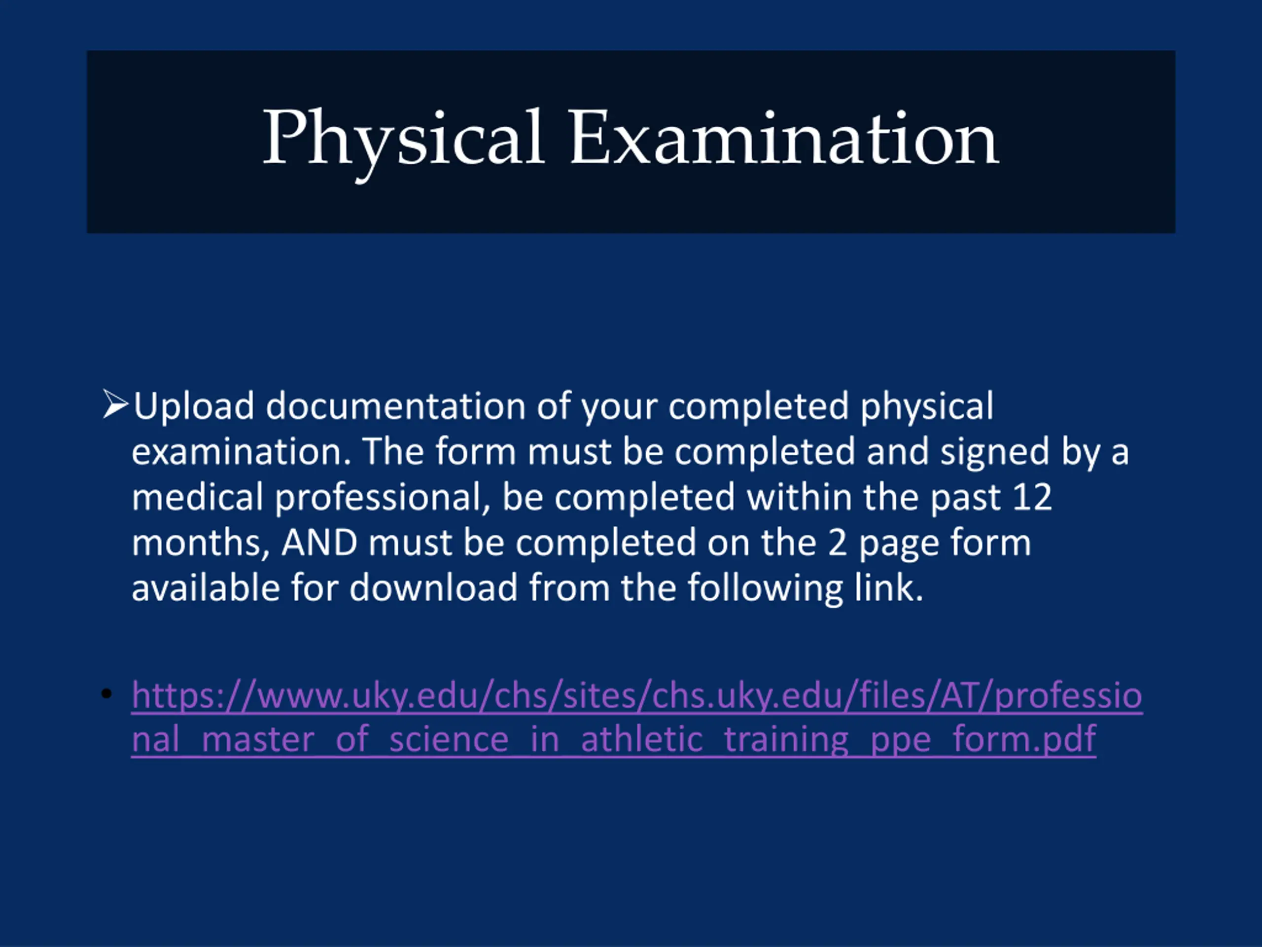 Physical Examination Upload documentation of your completed physical examination. The form must be completed and signed by a medical professional, be completed within the past 12 months, AND must be completed on the 2 page form available for download from the following link. https://www.uky.edu/chs/sites/chs.uky.edu/files/AT/professio nal_master_of_science_in_athletic_training_ppe_form.pdf