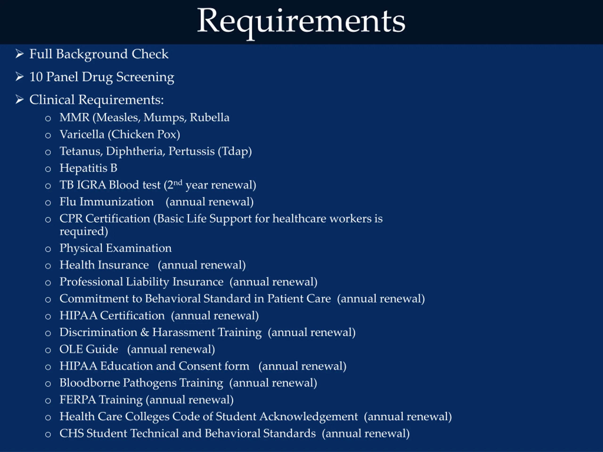 Requirements Full Background Check 10 Panel Drug Screening Clinical Requirements: o MMR (Measles, Mumps, Rubella o Varicella (Chicken Pox) o Tetanus, Diphtheria, Pertussis (Tdap) o Hepatitis B o TB IGRA Blood test (2ndyear renewal) o Flu Immunization (annual renewal) o CPR Certification (Basic Life Support for healthcare workers is required) o Physical Examination o Health Insurance (annual renewal) o Professional Liability Insurance (annual renewal) o Commitment to Behavioral Standard in Patient Care (annual renewal) o HIPAA Certification (annual renewal) o Discrimination & Harassment Training (annual renewal) o OLE Guide (annual renewal) o HIPAA Education and Consent form (annual renewal) o Bloodborne Pathogens Training (annual renewal) o FERPA Training (annual renewal) o Health Care Colleges Code of Student Acknowledgement (annual renewal) o CHS Student Technical and Behavioral Standards (annual renewal)