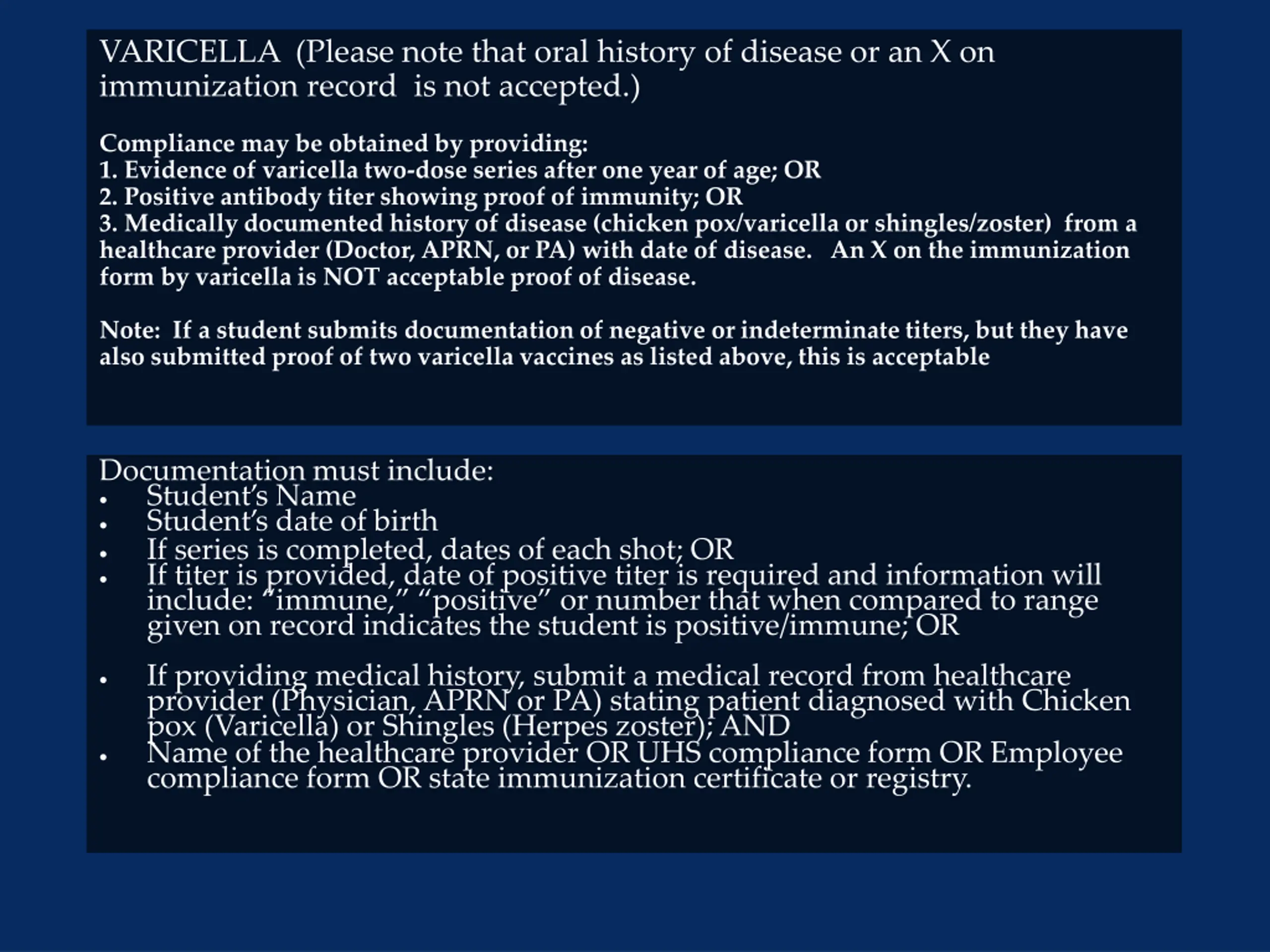 VARICELLA (Please note that oral history of disease or an X on immunization record is not accepted.) Compliance may be obtained by providing: 1. Evidence of varicella two-dose series after one year of age; OR 2. Positive antibody titer showing proof of immunity; OR 3. Medically documented history of disease (chicken pox/varicella or shingles/zoster) from a healthcare provider (Doctor, APRN, or PA) with date of disease. An X on the immunization form by varicella is NOT acceptable proof of disease. Note: If a student submits documentation of negative or indeterminate titers, but they have also submitted proof of two varicella vaccines as listed above, this is acceptable Documentation must include: Student s Name Student s date of birth If series is completed, dates of each shot; OR If titer is provided, date of positive titer is required and information will include: immune, positive or number that when compared to range given on record indicates the student is positive/immune; OR If providing medical history, submit a medical record from healthcare provider (Physician, APRN or PA) stating patient diagnosed with Chicken pox (Varicella) or Shingles (Herpes zoster); AND Name of the healthcare provider OR UHS compliance form OR Employee compliance form OR state immunization certificate or registry.