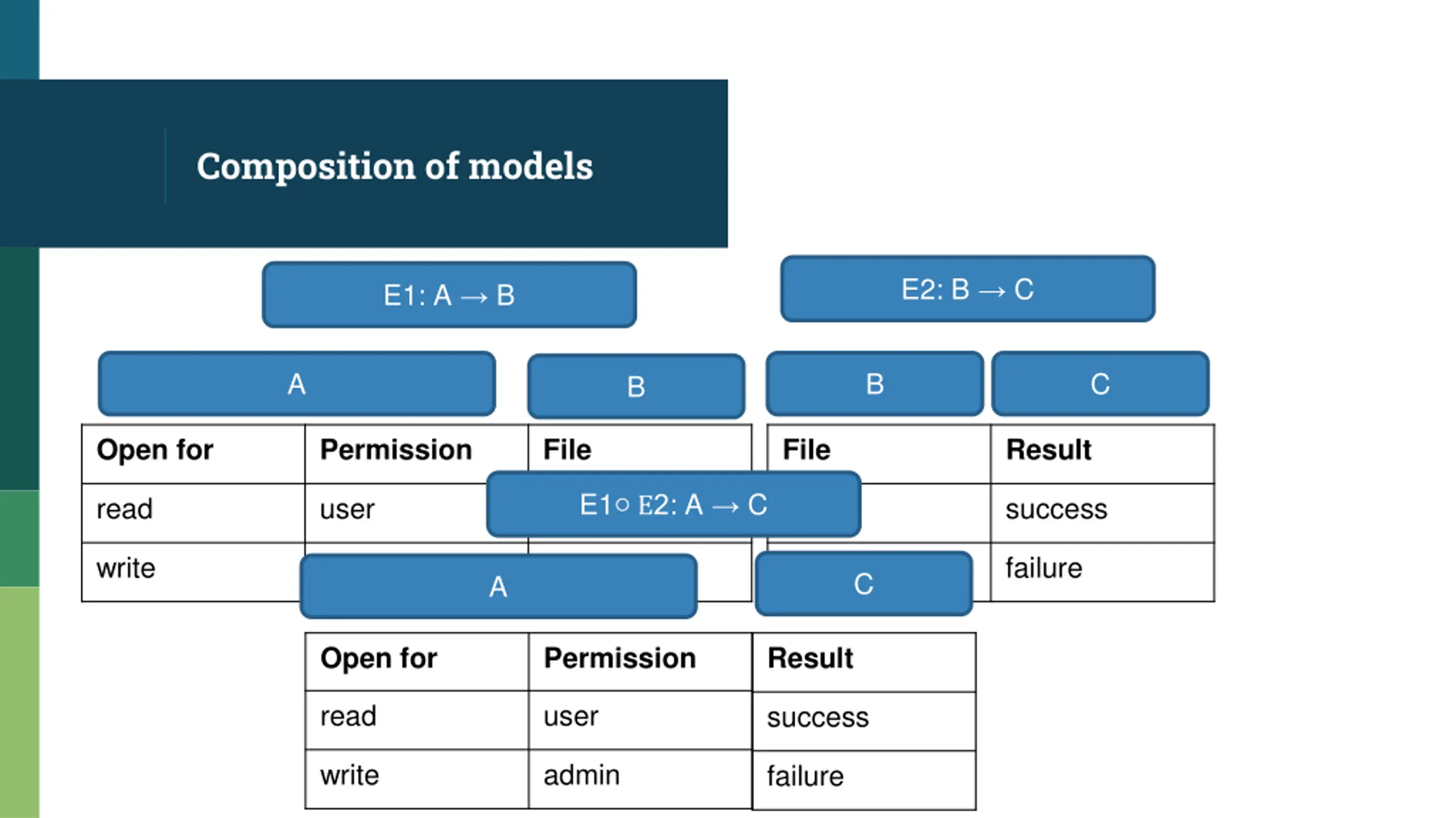 Composition of models E2: B C E1: A B A B C B Open for Permission File File Result E1 E2: A C read user small small success write admin large large failure C A Open for Permission Result read user success write admin failure