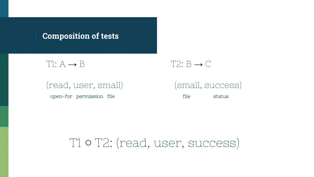 Composition of tests T1: A B T2: B C (read, user, small) (small, success) open open- -for for permission file permission file file file status status T1 T2: (read, user, success)