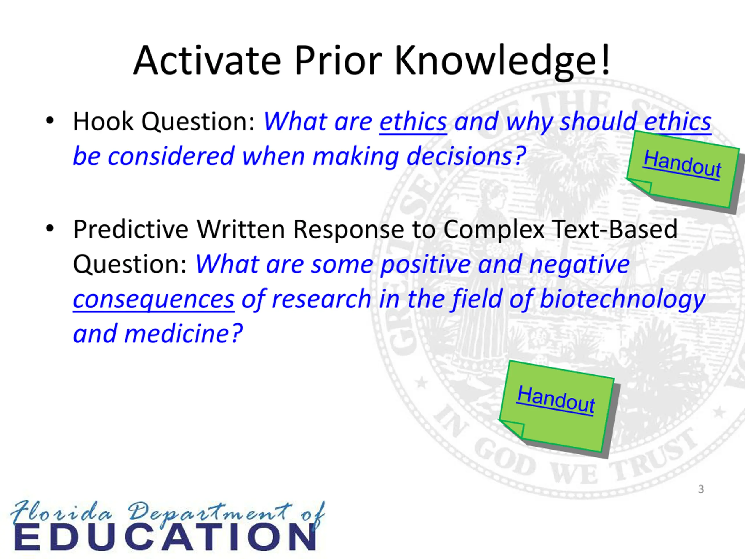 Activate Prior Knowledge! Hook Question: What are ethics and why should ethics be considered when making decisions? Predictive Written Response to Complex Text-Based Question: What are some positive and negative consequences of research in the field of biotechnology and medicine? 3